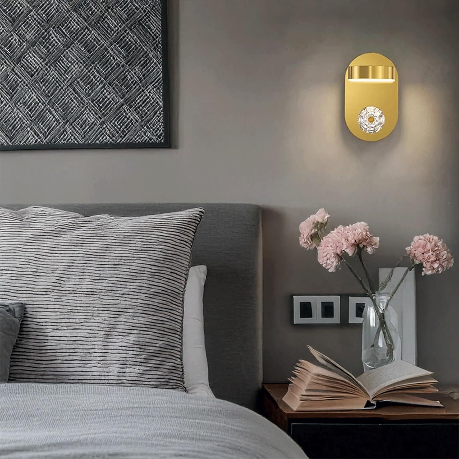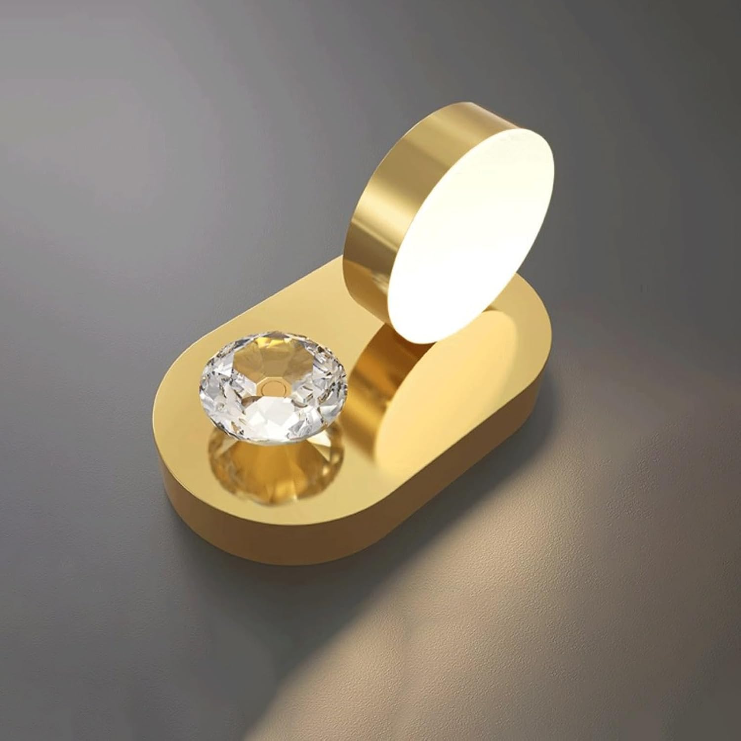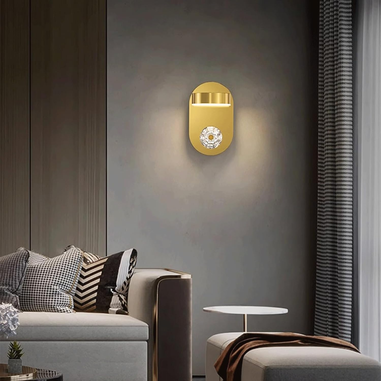 Product Parameters:Type: Wall Sconce / Wall LampStyle: Modern, Minimalist, Contemporary, Decorative, Ambient Lighting, Spot LightingMaterial: Copper, CrystalColor: Golden (copper), Clear (crystal)Dimensions:Fixture Body Length: 7.9" (20cm)Fixture Body Width: 4.7" (12cm)Fixture Body Height (Projection from Wall): 5.1" (13cm)Base Plate Length: 7.9" (20cm)Base Plate Width: 4.7" (12cm)Base Plate Height (Thickness): 1.0" (2.5cm)Crystal Diameter: 2.4" (6cm)Crystal Height: 1.2" (3cm)Spotlight Diameter: 3.9" (10cm)Spotlight Height: 1.0" (2.5cm)Light Source: LEDBulb Included: YesOptimized Special Feature: This modern LED wall sconce, crafted from solid copper with a golden finish, offers lighting functions. It features a faceted crystal element that creates a sparkling effect, alongside a functional spotlight for directed illumination. The LED light source emits a soft, inviting glow.Applicable Space: Ideal for Bedroom Bedside, Hallway, Living Room, Study Room, Entryway, or any space desiring modern minimalist design, ambient LED lighting, and a combination of decorative and functional illumination.