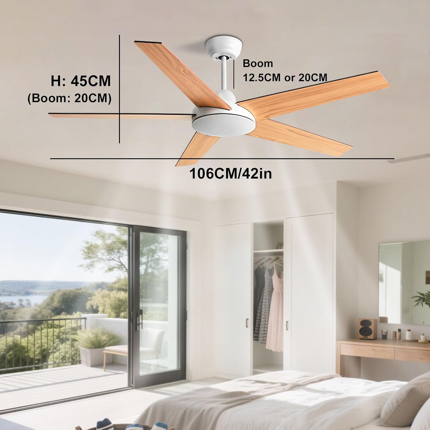 Style: Modern*Remote control: Including remoteRemote control distance:> 30mrColor: Black, Gray, White (reference image)*Material: Metal, Plywood fan blades *DC Motor*Fan blade: 5 pieces*Wind speed: 6 gear*Whether the wind speed is adjustable: yes (using the remote control, low / medium / high set around the third wind speed)SizeLength: 106CM / 42inHeight: 45CM / 17.7inBoom: 20CM *Use space: 8-20㎡Length: 132CM / 52inHeight: 45CM / 17.7inBoom: 20CM *Use space: 12-30㎡Length: 142CM / 56inHeight: 45CM / 17.7inBoom: 20CM *Use space: 15-40㎡*The package includes:1 x Ceiling fan1 x Accessories package1 x Remote*Scene: Remote ceiling fan with no light for bedroom, living room, dining rooms, study room, children's room, balconie, small bedroom, corridor, small living rooms, etc.*Tips: The ceiling fan is easy to remove and, clean, when you do the cleaning, cut off the power, please.*If you have any question ,please kindly contact us firstly,we are always here service for you.