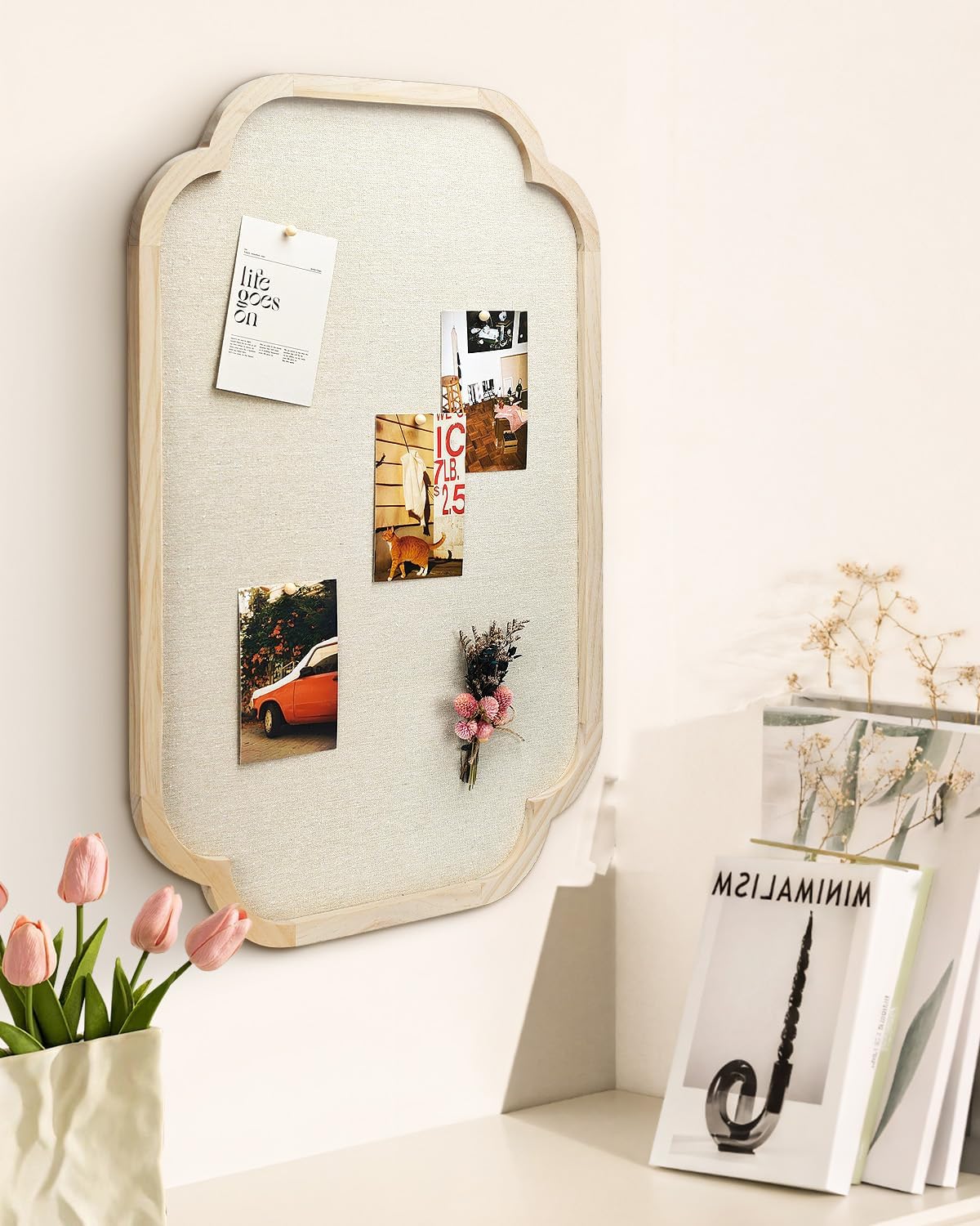 OKYDOKY Natural Wood Frame Scalloped Pinboard - 19.7x29.5 Rustic Fabric Bulletin Board for Farmhouse, Home Office & Vision Board Display