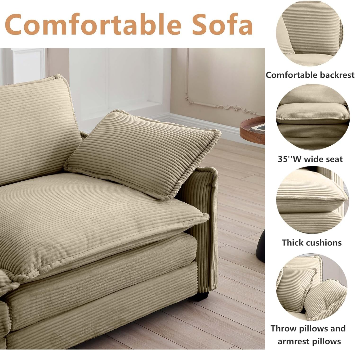 Specifications:1.Main Material: Corduroy2. Seat Fill Material: Foam3.Frame Material Type: Wood4.Seat Cushion Configuration: Multiple Cushion Seat 5.Cushion Construction: Multi-layer 6.Weight Capacity Maximum: 1000 Pounds7. Dimensions: Sofa: 115.34"W x 34.25"D x 33.85"H Ottoman: 37"W x 22.83 "D x 19.29 "HProduct Features:· Epitome of style and retro:this sofa is a perfect blend of fashion and retro, combining classic and modern elements. Its design is simple and generous, with smooth lines, showing a stylish atmosphere, while also retaining the charm of retro. The sofa surface is made of high-quality fabric, with a soft and comfortable hand feel and delicate texture. It is not only a comfortable piece of furniture, but also a highly valuable piece of art decoration.· Unrivalled comfort: enjoy the ultimate in comfort with this combination sofa. The ergonomic seat design and double-layered seat cushions filled with highly resilient memory foam provide cloud-like comfort. In addition, thick removable armrests and soft throw pillows provide extra support and comfort.· Sophisticated Corduroy Fabric:Indulge in our plush corduroy fabric, as soft as silk under your fingertips. This subtly opulent material balances softness and warmth, offering constant comfort. Its unique texture and soft sheen stand out, delivering gentle pampering, regardless of the season. Elevate your tactile experience with this extraordinary fabric.· Flexible sofa combinations: our sofas are perfect for living rooms, bedrooms, flats, clubs, home cinemas and children's play areas, and can be matched according to your preferences, with four colours to choose from, beige, camel, green and grey, which are perfectly adapted to any flexible sofa combinations: our sofas are perfect for living rooms, bedrooms, flats, clubs, home cinemas and children's play areas, and can be perfectly adapted to any decor styles.· Easy to assembly - assembly required, all needed tools included. Wipe regularly with a soft, dry cloth to prevent dust accumulation. Packages may arrive separately within a few days, please be patient. If you have any questions, you can ask the customer service for help.· Matching footstool: with the same colour corduroy fabric rectangular footstool, and your sofa perfect combination into a more comfortable resting place, bring you better relaxation!