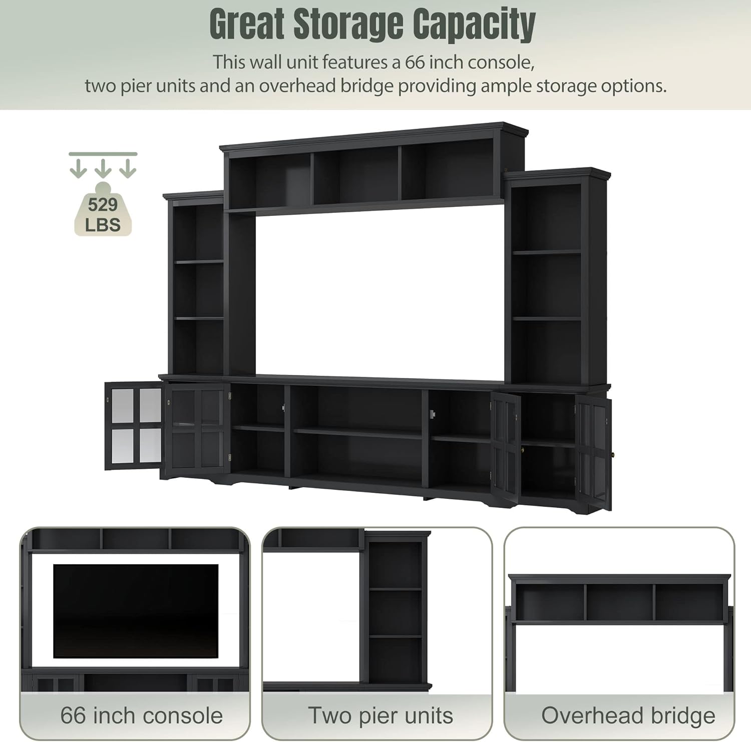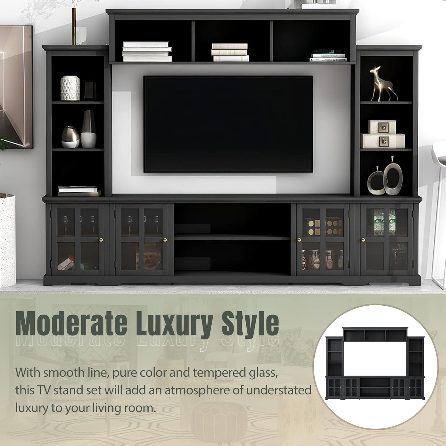GODAFA has many years of experience in making furniture, we focus on furniture, your home large and small furniture can be purchased from us, our main style is simple, so that our furniture is well integrated into your home, to bring you visual enjoyment. It is a truly all-in-one design that maximizes the use of cabinet space while providing storage solutions for a variety of items. It integrates TV cabinet, bookshelf, wine cabinet and display cabinet. With exquisite craftsmanship, it creates a paradise for personal relaxation and entertainment. You can create a personalized storage solution by mixing and matching different modules within the cabinet, creating a unique space that reflects your personal taste. The smooth lines of this TV stand create an elegant and modern look, soft solid colors blend into the background, and tempered glass adds a touch of sophistication that will add a subtle luxury atmosphere to your living room. Product Type: TV stand Top Color: Black Top Material: Particle board Top Finish Application: Veneer Base Color: Black Base Material: Particle board Base Finish Application: Veneer Weight Capacity: Overall: 529LBS / Table Top: 110LBS / Side Cabinet Shelf: 22LBS / Top Cabinet: 22LBS Detailed Measurement: Overall: 104.3"W x 78.7"D x 14.9"H / Side Cabinet: 16.9"W x 11"D x 13.5"H / Top Cabinet: 21.4"W x 12"D x 13.3"H Shelves Included: Yes Number of Shelves: 9 Country of Origin: China Table Top Thickness: 1.18inch Clearance - Floor to Bottom: 0.78inch Level of Assembly: Full Assembly Needed Suggested Number of People for Assembly/Install: 3 Estimated Time to Set Up: 3 h Adult Assembly Required: Yes