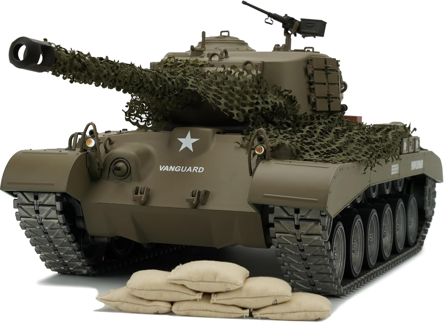 Features: *Upgraded / Metal road Wheel *Upgraded / Rubber Tires *Upgraded / Metal caterpillars tracks *Upgraded / Metal Sprocket Wheel *Upgraded / Metal idle Wheel *Upgraded / Metal Suspension Arms *Upgraded / 5000mAh High Power Rechargeable NiMH Battery *Upgraded / Gearbox version steel gear *Upgraded / Sound effect *Upgraded / turret rotate 360 degrees(left/right).(The old version can only rotate 320 degrees) Product function: *This tank can move forward, speed up forward and backward,accelerate backward, rotating, the barrel can be raised 30 degree. *The turret can rotate 360 degrees *Maximum vertical turning angel of gun (up/down) approximately 30-degree *Maximum climbing gradient (changeable on different road surfaces) *approximately 35-degree *Engine sound, machine-gun sound. *Specifications Gun Shell: 6mm standard BBs *Like real tank firing, shooting 6mm BB pellets with COOL hull-recoil action and firing sound effect. *Smoke effects simulator.Smoking like real tank from "engine". *Sound effects simulator.Each action acts with mimic real tank mechanical sound. *The complete electronic with remote control (Smoke and Sound system) *2.4Ghz radio control system, it supports many similar tanks combating together without radio intervening. Specification: Length: 21 inch,Width: 9.5 inch,Height: 7.8 inch,Scale: 1:16 Weight:17.5pound Warning: Please refer to the new version of the 2.4Ghz radio control system manual , because the old version of the manual is wrong.