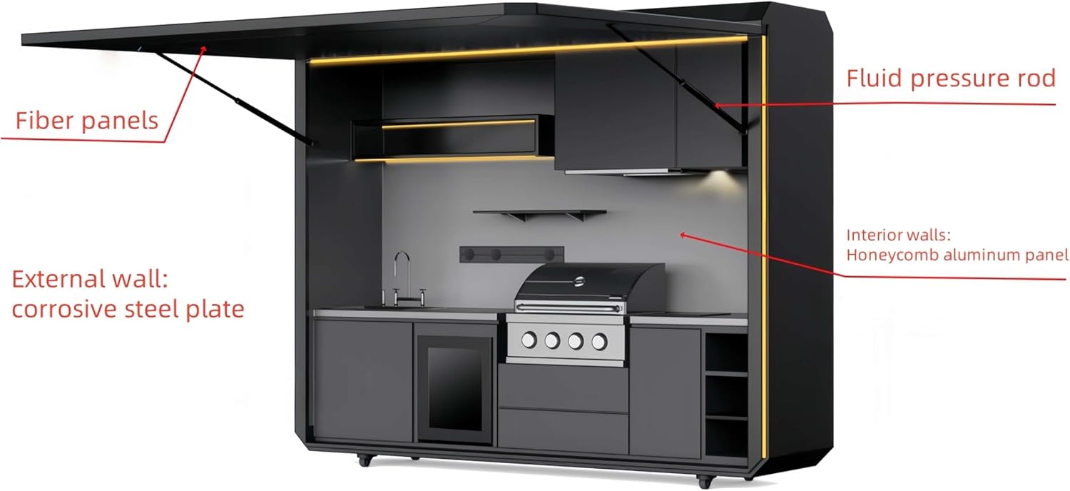 An outdoor kitchen is a multifunctional space that extends cooking, dining, and socializing from indoors to nature. Reasonably layout the barbecue area, operating table, sink, and storage unit to meet the needs of meal preparation, cooking, and cleaning. Allowing you to enjoy fresh air and expansive views in the garden, terrace, or courtyard, enhancing user comfort. Suitable for daily family use and gatherings with friends, effectively enhancing the quality of outdoor life and entertainment experience. As a manufacturer of outdoor kitchen pod, we aim to improve your outdoor cooking life with more designed products.
