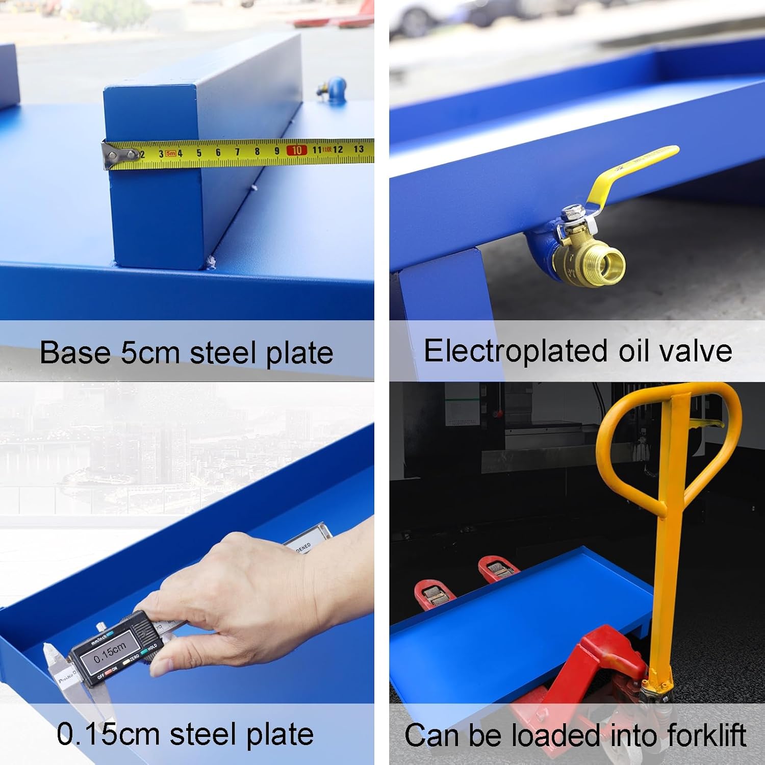 FEATURE1. It can be used in industrial parks, warehouses, factories, construction sites, and is suitable for all types of forklifts2. Multiple platforms can be spliced according to your needs, easy to use3. The overflow tray is sturdy and durable, with a wide range of applications, and can store various liquid containers neatly4. Model A is a leak-proof tray without grille, Model B is a leak-proof tray with grillePRODUCT PARAMETERSProduct Name: Leak-proof palletQuantity: 1Color:Yellow, BlueSize(LxWxH): 65x65x15cm,65x125x15cm1in=2.54cmcm=0.39inPRODUCT PACKAGINGType A:1 X leak-proof tray without grille;Type B:1 X leak-proof tray with grille;Notice:Please choose the right size before purchase.