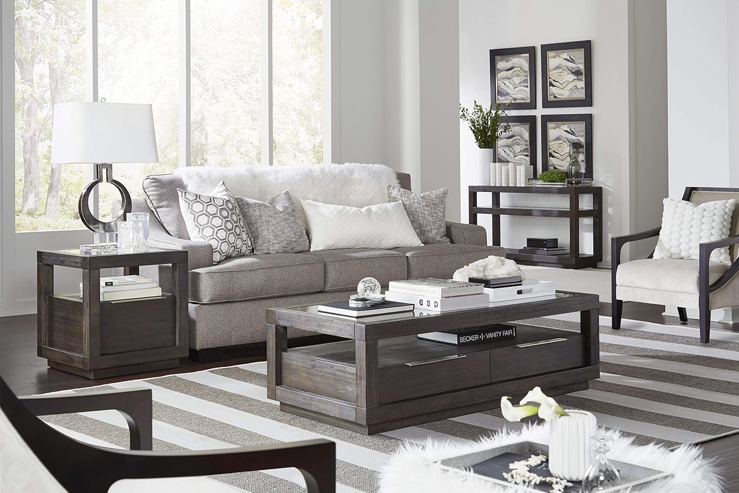 The Oxford collection makes a striking first impression with bold proportions, crisp, modern lines and a weathered finish. Smartly accented with top-mounted nickel plated pulls, tempered glass, and a floating plinth base. Available in Basalt Grey.