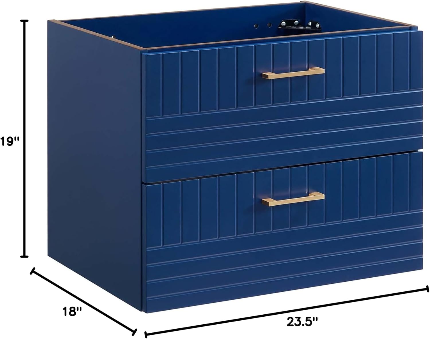 Refresh your bathroom space with the contemporary style of the Daybreak 24" Wall-Mount Bathroom Vanity. Featuring a modern silhouette, sophisticated matte finish, and brushed gold metal hardware, this vanity is durably crafted with a blend of rubberwood, MDF, and particleboard to create a lasting vanity for your bathroom. Mounting directly to your wall and saving substantial floor space, this bathroom vanity is complete with ample storage in its drawers to accommodate bathroom essentials and a cut-out design in the top drawer for plumbing. Assembly required. Sink basin and fixtures not included.Features:- Materials: Rubberwood, MDF, particleboard- Finish: Blue- Wall-mount design- Full-extension drawersSpecifications:- Product Dimensions: 19"H x 23.5"W x 18"D- Product Weight: 40 lbs
