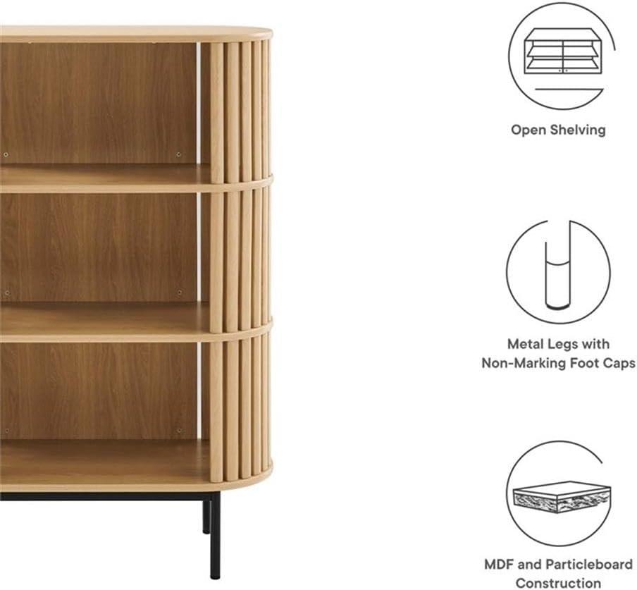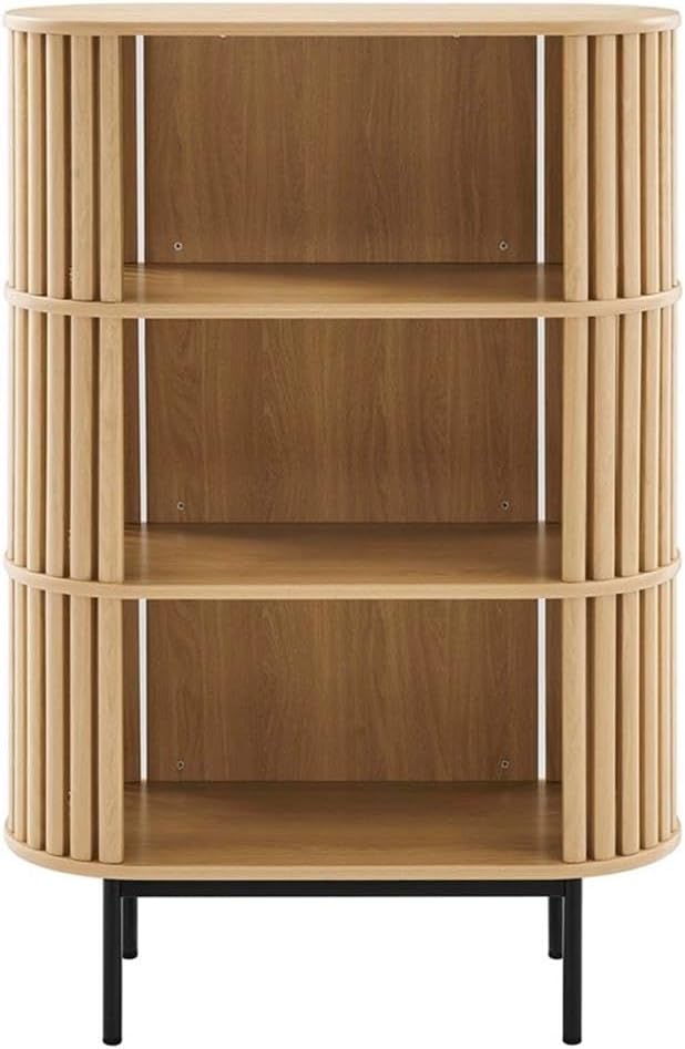 Enrich your living space with the Fortitude Three Tier Display Cabinet Bookshelf. Designed for the living room, office, bedroom, or entryway, this bookshelf features three tiers of open storage shelves perfect for displaying books, photos, and more. Crafted from MDF and particleboard with a wood grain finish and a timber style strip design, this piece is both durable and stylish. The round metal legs offer stability and an added touch of modern appeal. Includes non-marking foot caps. Assembly required.
