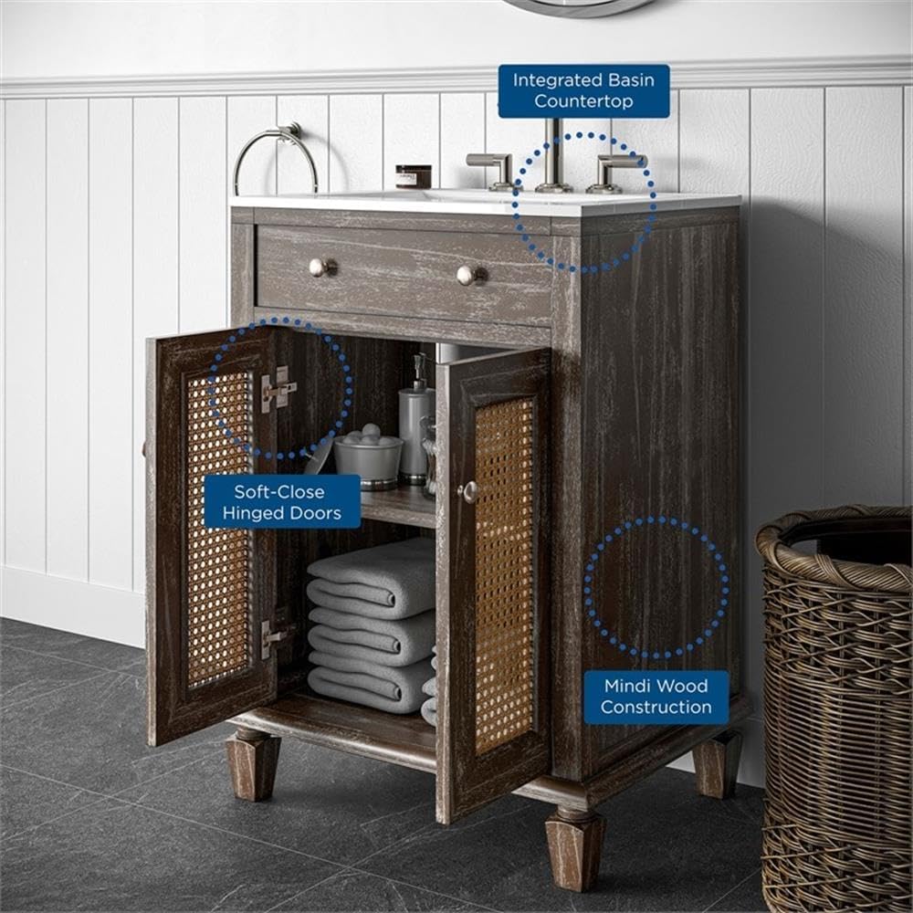 Encompassing the coastal aesthetics of tropical design, the Lilo 24" Bathroom Vanity effortlessly updates a bathroom space. Durably constructed with solid mindi wood, this vanity features a faux top drawer and two soft-close hinged doors adorned with natural rattan cane detail. Behind the two closed doors is an adjustable shelf and ample storage space to keep visual space clean and your bathroom essentials organized. This wood vanity features a ceramic sink basin with 8-inch centerset holes and an integrated countertop aligning style and function. Includes non-marking foot caps. Assembly required. Fixtures not included.