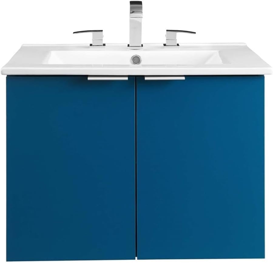 Incorporate modern aesthetics and contemporary style into your bathroom decor with the Maybelle 24" Bathroom Vanity. This vanity features a durable melamine construction with ample storage space for all your bathroom essentials behind two soft-close hinge doors with metal L-shaped handle pulls. Continuing the look of this modern vanity is a ceramic sink with an integrated countertop and 8" centerset faucet holes. Mounting directly to the wall, this bathroom sink vanity saves a substantial amount of floor space. Assembly required. Sink fixtures not included.