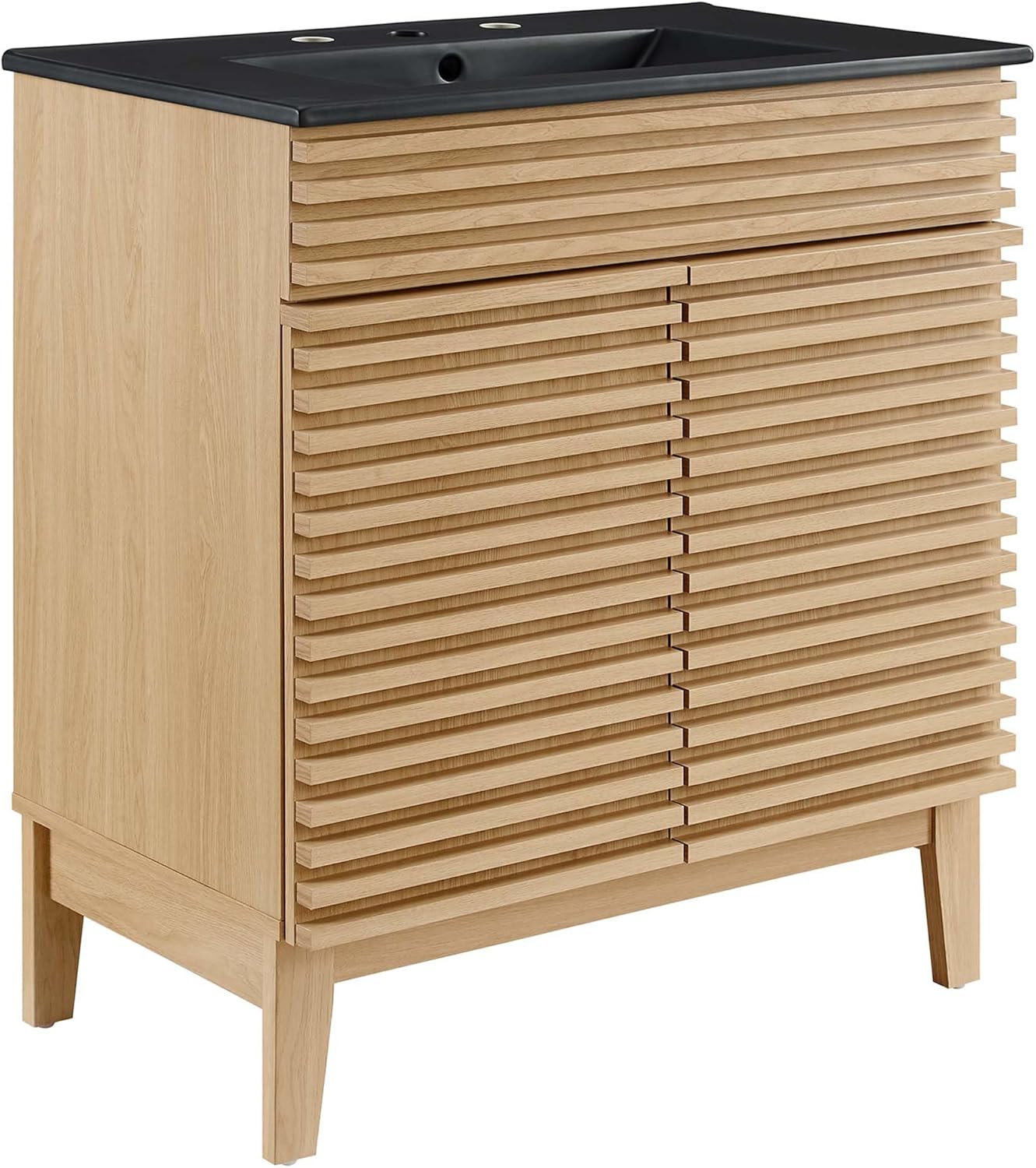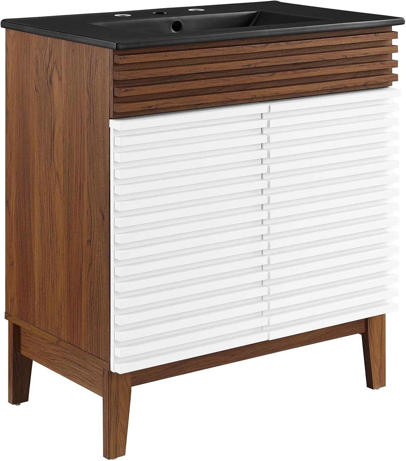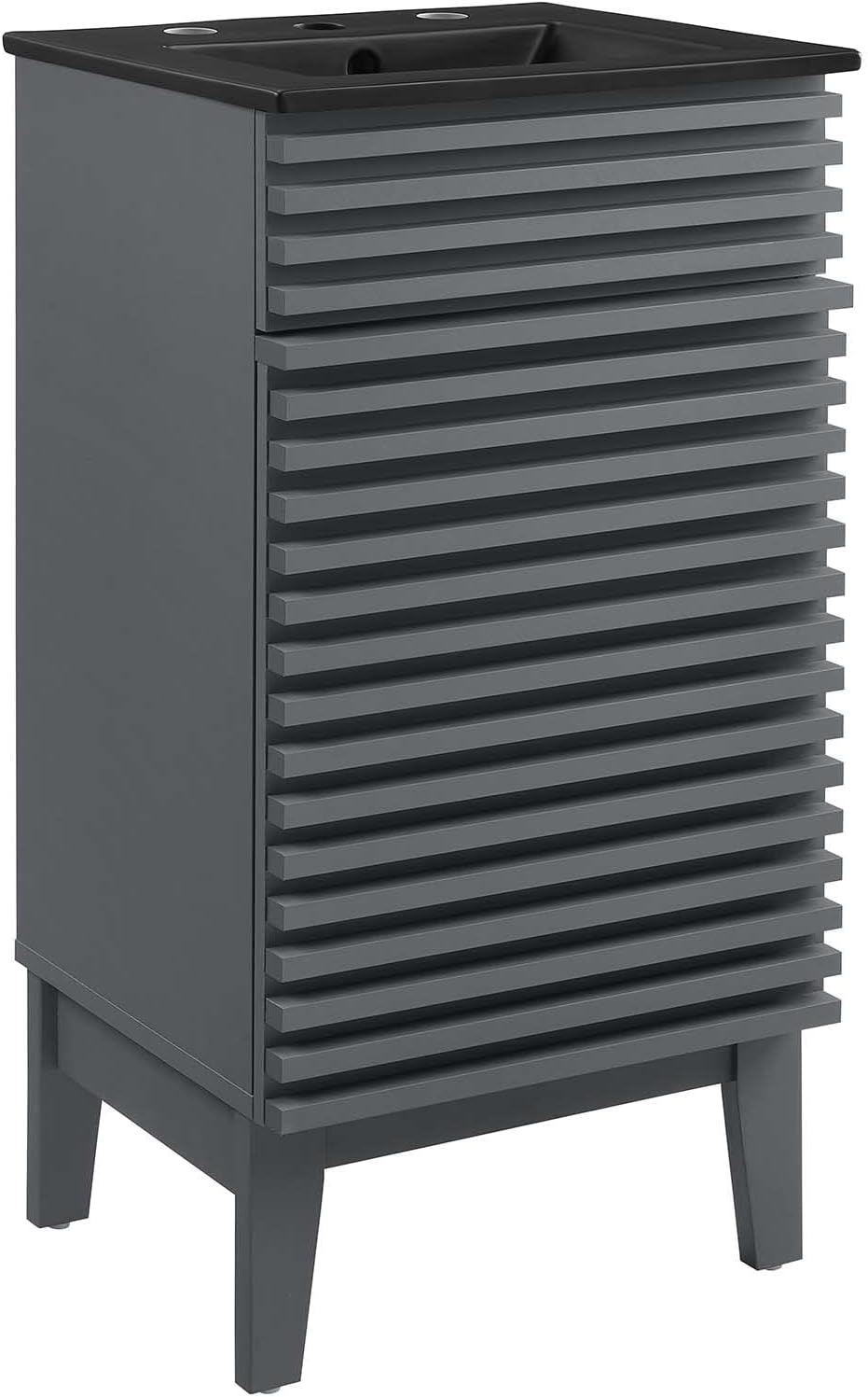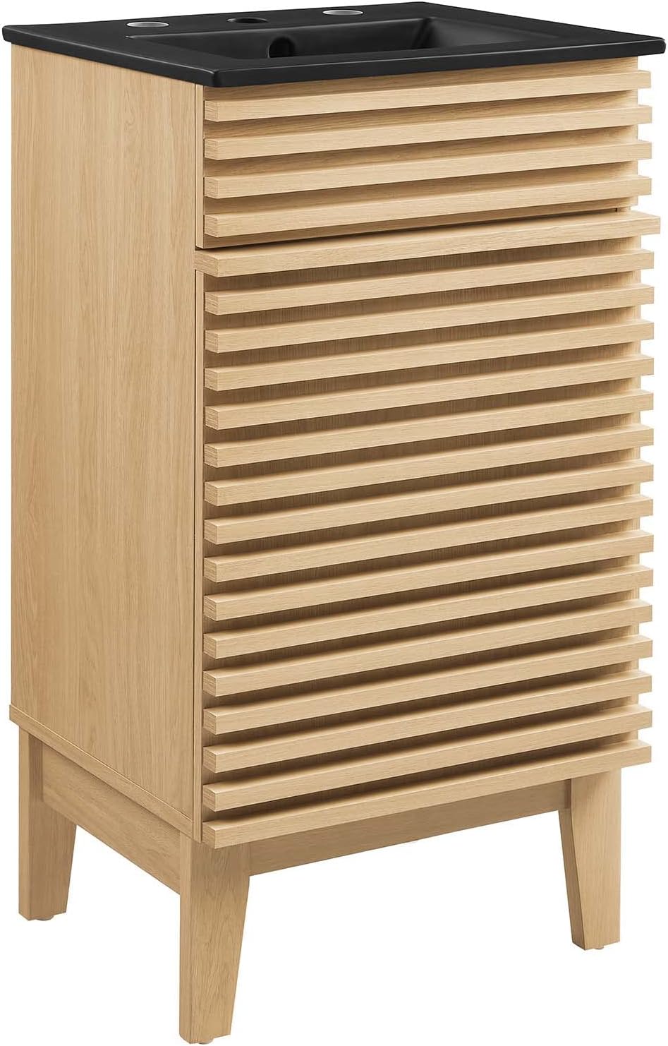 Tap into mid-century aesthetics with the Render Vanity. Render Bathroom Vanity features a durable particleboard frame with smooth laminate, four tapered wood legs, and adjustable storage shelf behind two soft-close hinged doors. A curved ceramic basin and integrated countertop with three faucet holes create sleek lines and crisp design for an edgy style designed to meet your needs. Boasting a mid-century modern style this vanity features a solid construction with a pleasing look and practical functionality. 8" centerset faucet holes. Assembly required and fixtures not included.