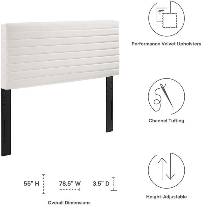 Add distinguished style your master bedroom or a guest room with the timeless elegance of the Tranquil Channel Tufted Performance Velvet King/California King Headboard, meticulously upholstered in stain-against performance velvet with horizontal channel tufting. This king/Cali-king padded headboard blends contemporary sleekness and subtle glam deco style for a refined focal point in mid-century modern or minimalist settings. Bolstered with dense foam padding, this king/California king upholstered headboard is a model of firmness and strength. Tranquil is a height-adjustable headboard with seven mounting positions. Assembly required.Features:- Material: Wood- Finish: White- Stain-against Fabric- Dense Foam Padding- 7 Mounting Positions- Dense Foam Padding- Channel Tufted King/California King Headboard- Performance Velvet UpholsterySpecifications:- Product Dimensions: 23"H x 78.5"W x 3.5"D- Product Weight: 27 lbs- Assembly Required: Yes