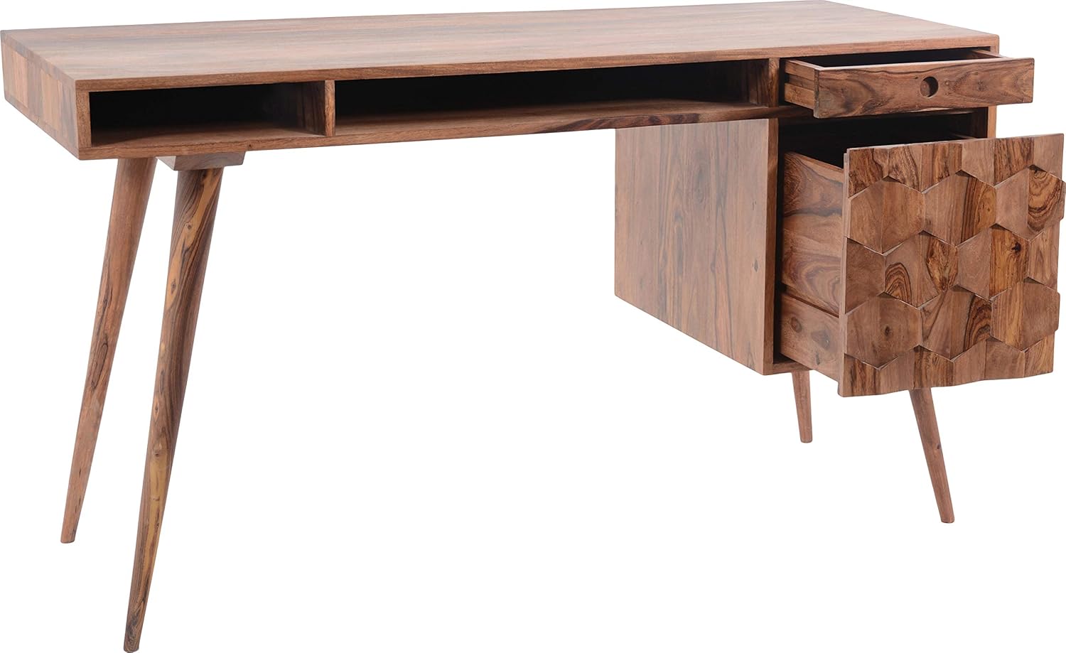 Mid-century style writing desk with cabinet, drawer, and open Slot for storage. Made of solid sheesham wood, the intricate wood pattern on the cabinet face makes this desk beautiful and eye-catching. Includes a one-year against manufacturer defects. Since the Mid 1990’s, Moe's family-owned business has dedicated time to creating pieces for your home that can be viewed with the ultimate pride. We understand just how important A home Can be, serving Not only as a reflection of those who live within its walls, but also displaying the beauty and functionality of items that occupy its space. Moe’s firmly believes that the home provides an environment of comfort and positivity, and this belief is exemplified in the detail and care we give to every piece of furniture, accent piece, wall decor, and pillow.