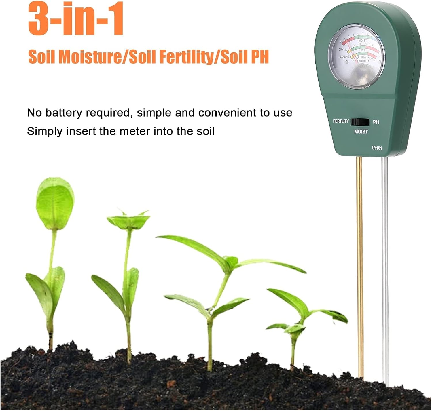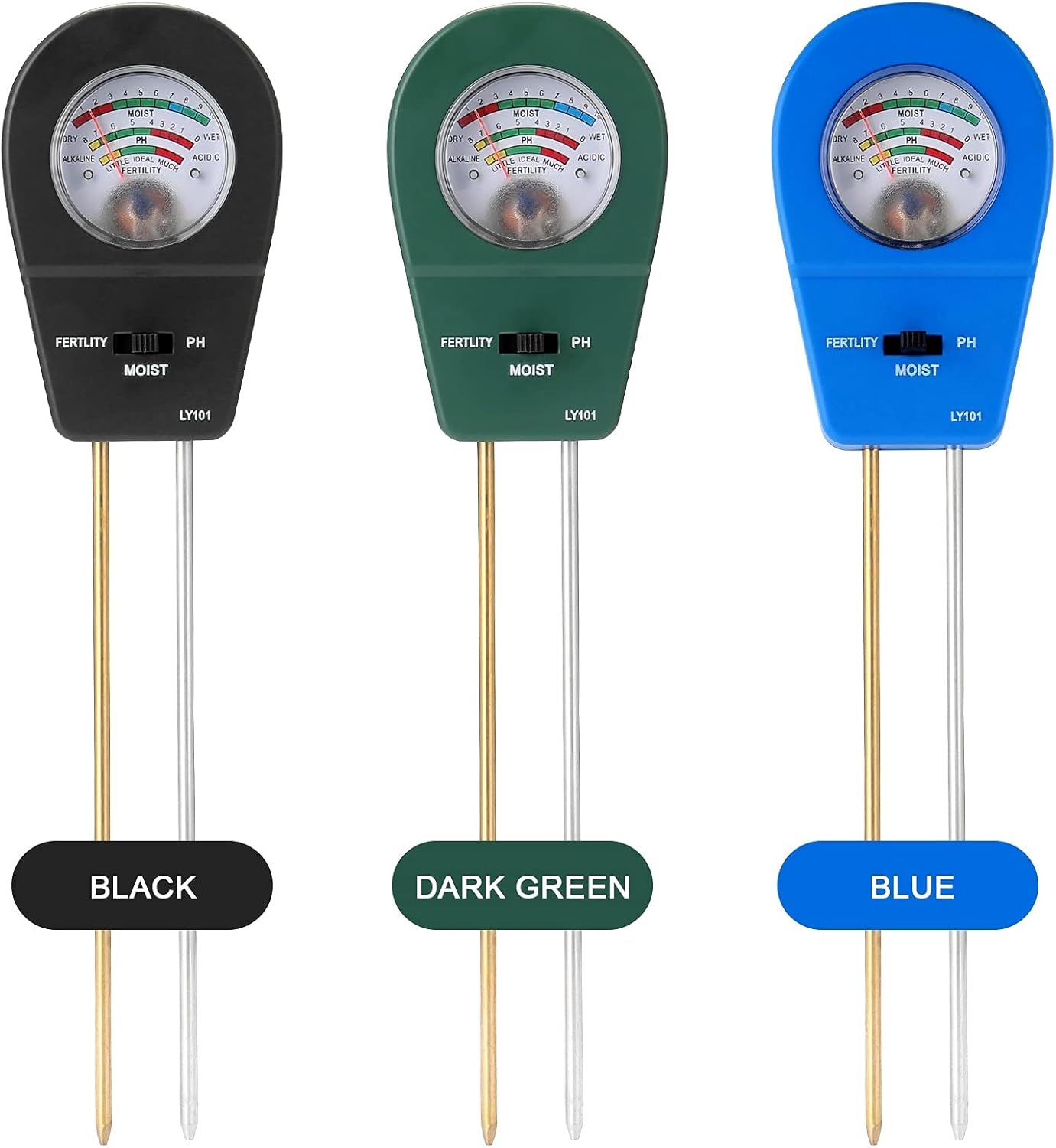 Features: Scientifically accurate: Easy &accuratelyto read moisture, pH and light levels, promotes healthy plants. Know when to water, adjust pH, or change lighting for your garden, flowers, plants both indoor and outdoor. No battery required, simple and convenient to use. Simply insert the meter into the soil. Just need and read. It's very easy to use. It can make people targeted to supplement the nutrient elements needed by crops, improve crop yield, improve the quality of agricultural products and save labor. Dual pins design for faster and more accurate detection of soil analysis soil. Specifications: Test function: soil moisture, soil fertility, soil PH value Color: dark green, blue, black (optional) Material: ABS Item size: 240 * 59mm / 9.5 * 2.3in Item weight: 78g / 2.7ounce Package size: 265 * 65 * 40mm / 10.4 * 2.6 * 1.6in Package weight: 111g / 3.9ounce Packing List: 1 * Soil PH Meter
