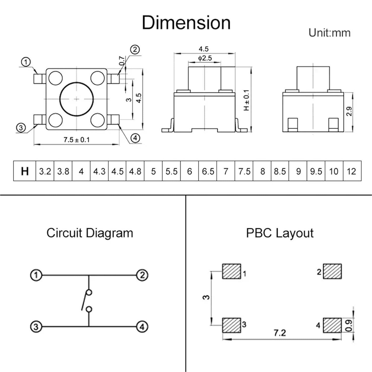 KeyswitchesMomentary Tactile Tact Push Button Switch On Off 4 Pins Electronic Set 50PcsMaterial : PlasticMaterial : Plastic, Metal, Electric PartsSize : 4.5*4.5mmRating : 50mA 12V DCVoltage : 250V AC 50HZ 1min