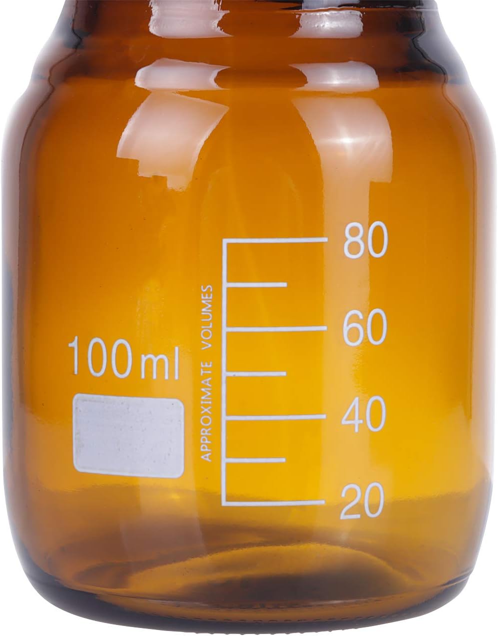 · Capacity of Each Bottle: 100 mL, permanent white enamel graduations from 20 mL to 80 mL, accurate scales · Amber Glass: thick, tough, high quality, reduce UV light, low coefficients of thermal expansion, resistant to thermal shock, high chemical resistance in corrosive enviroments · GL45 Screw Cap: Blue GL45 screw cap, tight seal, drip-free, seal tightly · Autoclavable: Up to 120℃, reusable, enviromental friendly, easy labeling · Glass bottles fit for storage of media, biologicals and other liquid solutions for lab, experiment, chemistry, scientific studies and storage at home