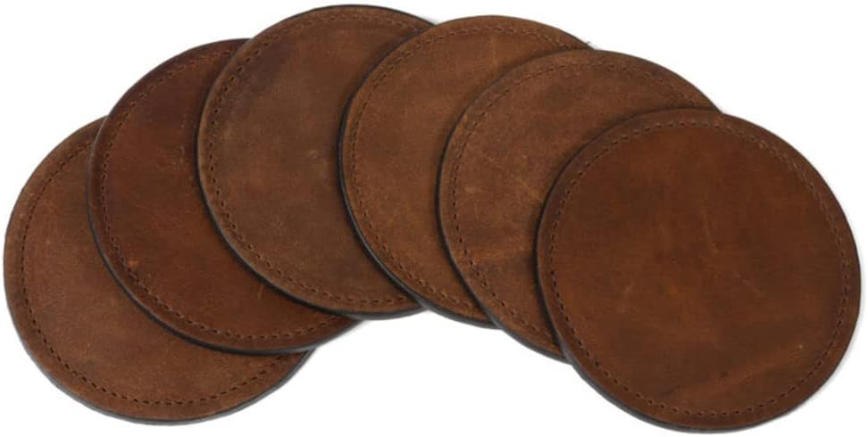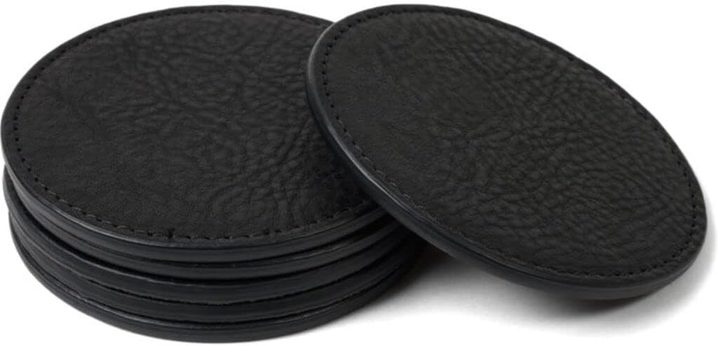 Serve up cocktails in style with our luxurious leather coasters. Available in some of our most popular leathers, they feature brown suede on the underside to prevent slippage. Set of 4. Specifications: Four coasters Material: 100% leather Dimensions: 3 ¾" diameter, width 3/16" Feature brown suede to prevent slippage Made in the USA