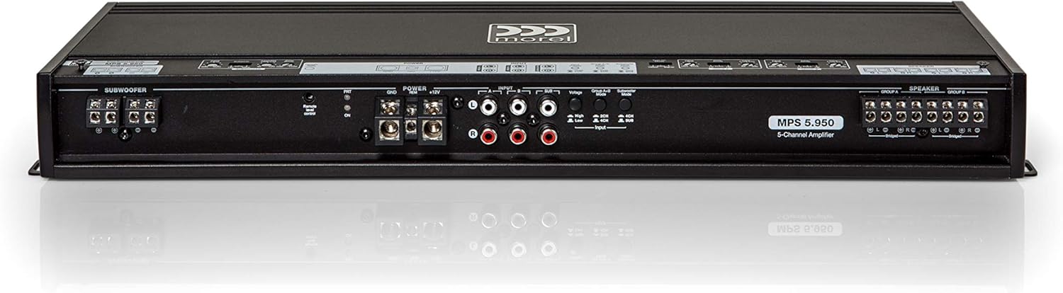 Power station Morel built this MPS 5.950 amplifier so their high-performing speakers and subwoofers would have an amp worthy enough to power them, delivering high-fidelity musical reproduction along with pure, clean power. The MPS 5.950 can send 70 watts RMS to each of your front and rear speakers plus 550 watts RMS to a sub, powering a full system from its 18-5/16" long chassis. You can also set this amplifier to 3-channel mode and power a couple of high-performance speakers with 200 watts RMS each, while sending a sub 550 watts. Low-noise design Morel made sure that every detail of this amplifier's design would result in lower noise and higher sound quality. The front and rear channel's Class AB architecture achieves the cleanest signal with the least distortion. The sub channel's Class D design puts out clean signal with very little noise. Balanced differential inputs reject interference. An onboard microprocessor controls the thermal management system, keeping the amp running cool and steady no matter how hard it's driven. All the connections are on one side of the amp to keep wiring neat, organized, and simple for the installer. Tone controls for every occasion The high-pass, low-pass, subsonic filter, bass boost, and gain controls sit protected under a top panel. Their intuitive operations and functions make it easy to match the amp's output to your speakers and sub - and achieve great sound. This amplifier's modest exterior shelters high-quality electronic components that guarantee an accurate and musical performance.