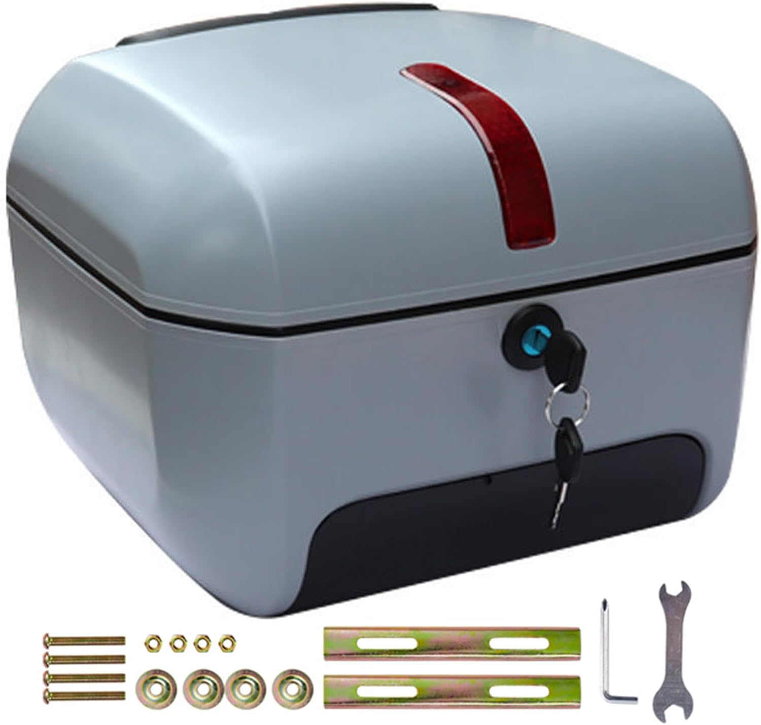 Motorcycle Scooter Top Box Tail Trunk Top Case Luggage Box, 28L Capacity, Storage Carrier Case Can Store Helmet, Universal Tail Case for Motorbike Moped Back Rear CaseFeature:- Water resistant, shockproof , keeps everything dry during wet weather conditions. Protect items from the sun, rain and wind.- 28L large capacity internal space, Meet your daily travel needs. - Link pull belts link base and cover which can effectively reduce vibration during driving.- Safety lock hook, safe and anti-theft, easy to use, good quality!- The backrest is ergonomically designed.- Quick installation system, easy to disassemble without tools.- The large reflector provides additional security.- Suitable for scooters, mopeds, motorcycles, quad bikes, ATVs, etc.Specification:Color: Black, Blue, Cyan, Grey, Light blue, Matt black, Purple, Red, Sapphire blue, Silver, White, YellowMaterial: High Quality ABS+PP PlasticOutside dimension: 13.8" L x 13" W X 9.8" HVolume Capacity: 28LWeight: 1.6kg/3.5lbWeight Capacity: 30kg/66lbPackage includes:1x Motorbike top case1x Mounting bracket2x Safety keys (Fitting)Note:Please check your motorcycle brackets to see if it fits your motorcycle, any question please feel free to contact us. We will reply and deal with it within 24 hours.