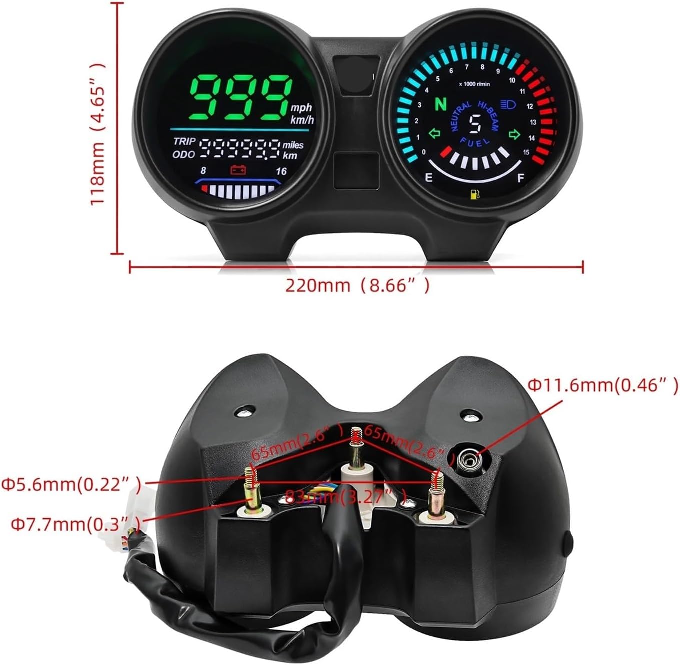 Motorcycle Tachometer LED Digital Dashboard Fuel Level RPM Meter hour counter For TITAN150 For CG150 Fan150 2010 20121. Mileage: ODO (total mileage) maximum display mileage is 99999km, TRIP (subtotal mileage) maximum displayThe indicated mileage is 999.9km, which can be switched between metric and imperial systems;2. Tachometer: The maximum speed is 199km/h, which can be switched between metric and imperial systems;3. Line description:green: negative pole,black: positive pole,orange:trun lamp,yellow white: oil level,gray: turn lamp,blue: high beam lamp,green white: neutral,blue white round head wire: engine speed4. Button: switch between total mileage and subtotal mileage, subtotal mileage to zero, parameter setting;Special Features : ABSItem Weight : 710gModel Name : Tachometer RPM Meter OdometerModel Name : LED Digital DashboardMotorcycle Gauge : Tachometer GaugeDecoration: The smooth streamlined design of the motorcycle tachometer odometer adds charm to your motorcycleDesign: The motorcycle digital odometer does not require complicated operations, saving your time and energyHope you can buy your favourite products in the shop, welcome to the next visit.
