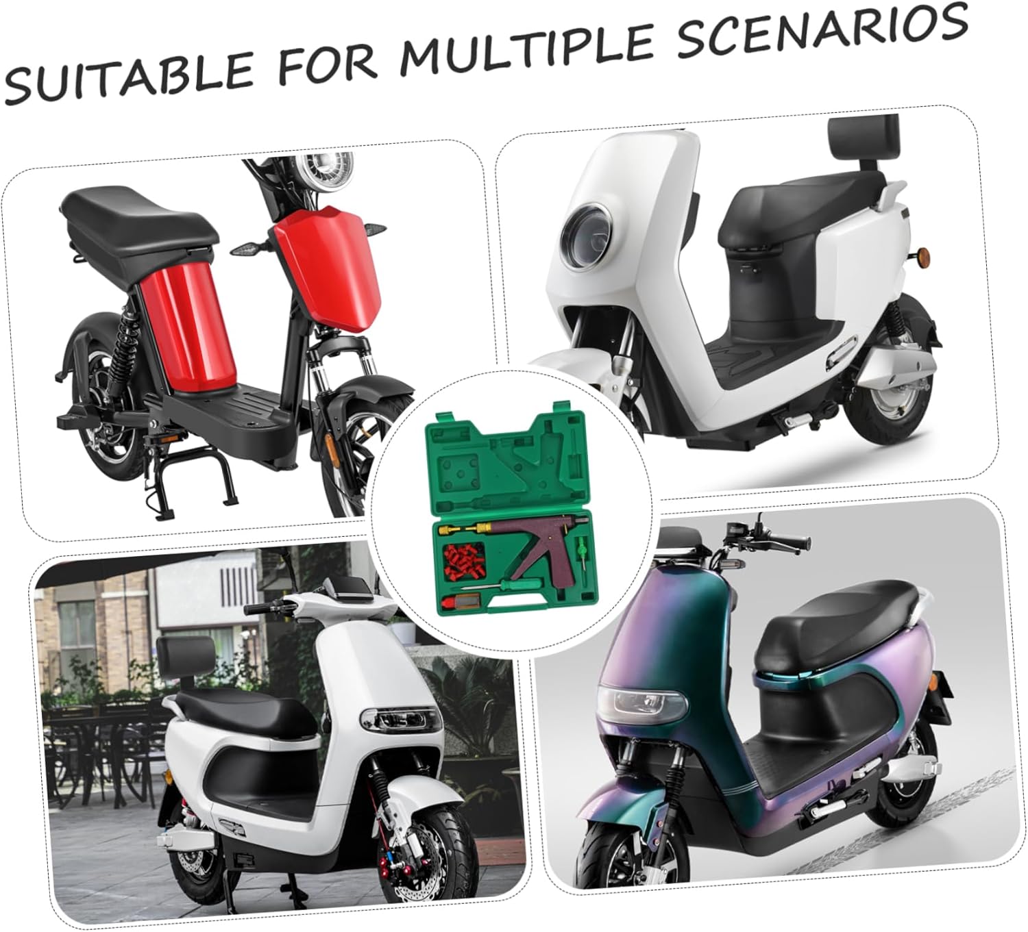 Package Include 1 x Tire repair tool 2 x nozzles 1 x awl 1 x plate 1 x lubricating oil 1 x bag of tire repair nails 1 x specification Characteristics -Material: ABS, copper, iron, rubber, oil car tire patch kit -Versatile and practical: compatible with a wide range of vehicle models, making it a versatile choice motorbike tire fixing kit. -Size:28.50X15.00X2.40cm/11.20X5.89X0.94in tire hammer -User friendly design: simple operation, suitable for anyone without the need for professional skills motorbike accessory. -Built to last: made from selected materials for performance and reliability flat. -Color:Assorted Color motorcycle tire tools -Portable and compact: easy to carry around, ensuring you're always prepared for tire repair emergencies motorcycle wheel repairing tools. -Quick and efficient repair: repair punctures in a matter of minutes, minimizing downtime quick tire repair tools.Goods Descriptionmotorcycle fixing kit Its versatility allows it to be used on various vehicle models, making it a practical choice.tire fix kit for motorcycle With its quick repair feature, you can repair punctures in just a matter of minutes, saving you time and effort.tire tool for motorcycle The Motorcycle Car Tire Repair Tool is the solution for all your tire repair needs.motorcycle repairing tool Whether you ride a motorcycle or own an electric vehicle, this tool is a must-have
