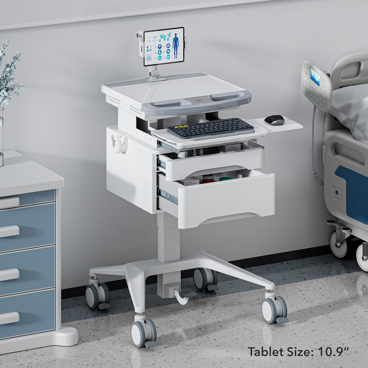 Introducing our innovative mobile medical cart, meticulously designed to integrate technology and patient care seamlessly. With a pneumatic height adjustment ranging from 31.5" to 45.3" via an easy foot pedal, this cart adapts to any user's needs. Ideal for tablets between 4.7" and 12.9" and supporting weights up to 2.2 lbs, the easy-to-install tablet mount's screen rotation, swivel, and tilt features offer full motion adjustments and effortless screen sharing. Four large 360° casters with a locking mechanism ensure the cart is both mobile and stable as needed. The built-in handle allows for smooth movement between rooms. Enjoy an abundance of storage space with two drawers, a side tray and a scanner holder to keep the workspace clean and tidy. Additionally, the cart features a spacious platform and a sliding keyboard tray with an integrated mousepad. Perfect for treatment rooms, urgent care centers, therapy rooms, nursing homes, and patient rooms, our rolling medical laptop cart is the ultimate solution for modern healthcare environments.