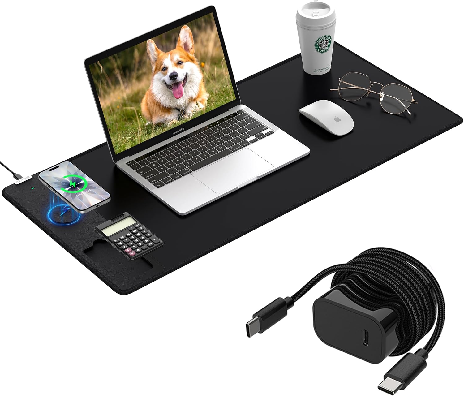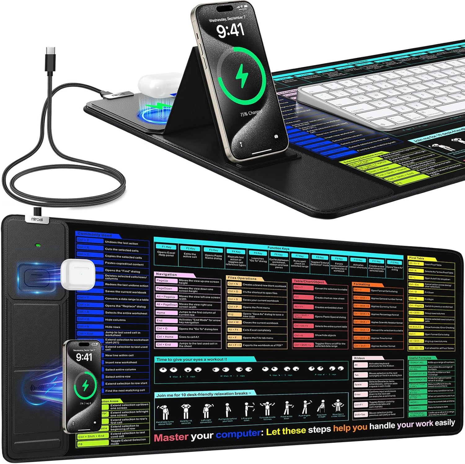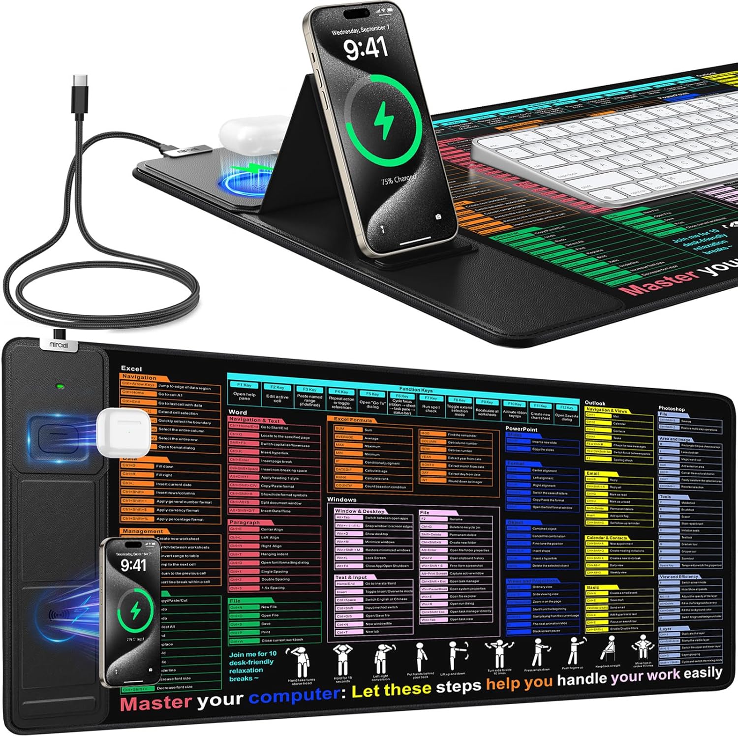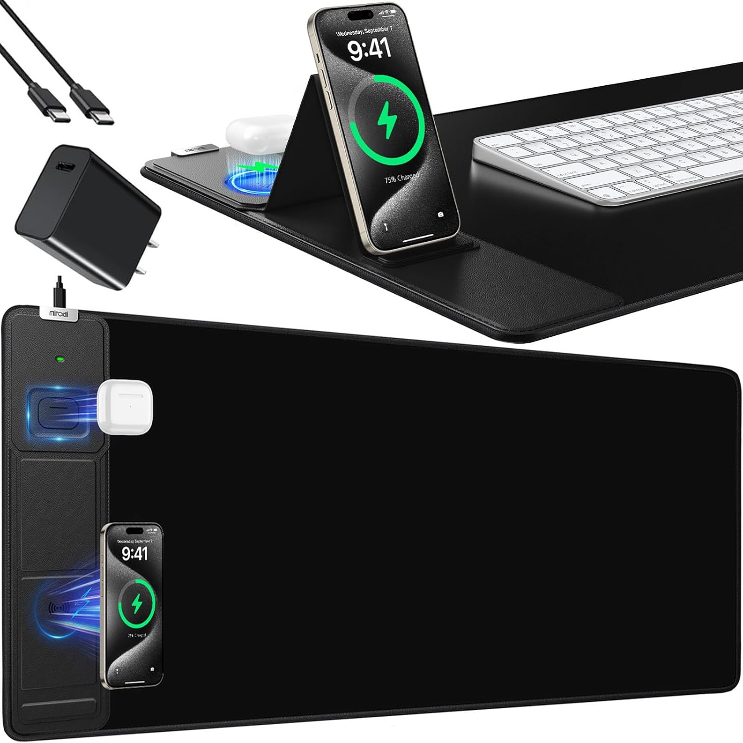 | Additional Features | 31.5"x15.8" Large Mouse Pad for Desk, Desk Pad with Phone Charger, Mouse Pad with Foldable Phone Holder, Wireless Charging Desk Mat, Wireless Charging Mouse Pad |