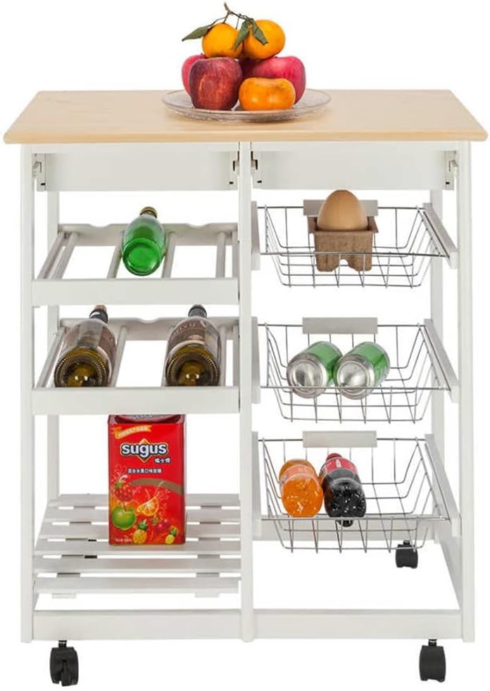 This is a kitchen cart with two drawers, three metal baskets and three shelf panels.It is made of pine and PVC panels, which is light and stable. metal handle will not cause rust problem due to long-term oxidation. nylon casters can be 360 degrees pushed and pulled.Two main drawers can store your tableware supplies. Three metal baskets can be placed in various types of fruits, vegetables and various types kitchen supplies. Two wine shelves can hold 6 bottles red wine for you.In addition to being used as a kitchen cart, it can also be used as a small dining table in the restaurant.Features:1. Pine and PVC panel2. Metal handle3. 360 degrees swivel caster4. Two drawers, metal basket and three racks5. Convenient to assembleSpecifications:1. Material: Pine & PVC Table Top2. Color: White3. Product : (67 x 37.5 x 76)cm / (26.38 x 14.77 x 29.92)" (L x W x H)4. Drawer : (26.3 x 25.8 x 5)cm / (10.35 x 10.16 x 1.97)" (L x W x H)5. Metal Basket : (28 x 29.5 x 7)cm / (11.02 x 11.62 x 2.76)" (L x W x H)6. Rack : (28.7 x 33.3)cm / (11.30 x 13.11)" (L x W)7. Weight: 9.2kg / 20.28lbsPackage Includes:1 x Kitchen Cart1 x Accessories Kit1 x InstructionNote:Light shooting and different displays may cause the color of the item in the picture a little different from the real thing. Manual measuring,please allow 1~3mm error,thank you.It is evenly colored and known for its hardness.
