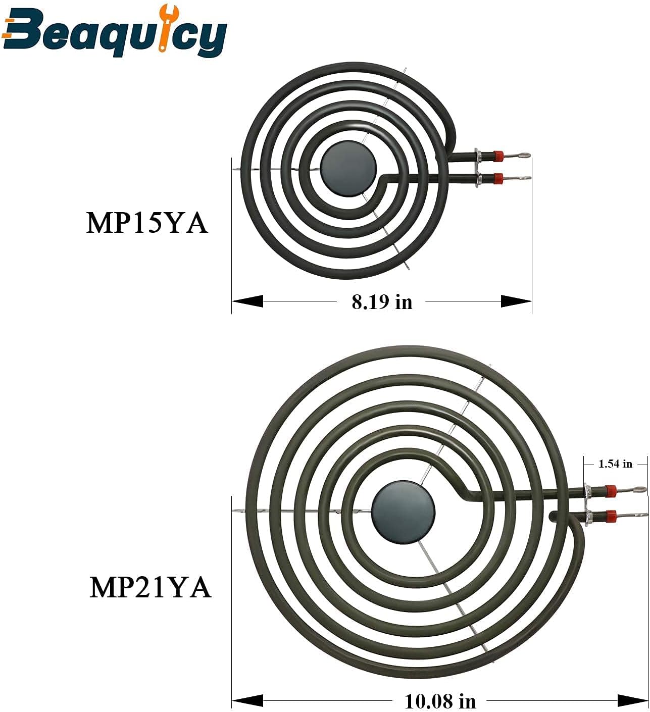 PRODUCT DESCRIPTION: MP22YA Electric Range Burner Element Unit Set: MP22YA Electric Range Burner Element Unit are made of non-metallic material with large resistivity, small temperature coefficient of resistance, low deformation at high temperature and not easy to embrittle.WB31M19 WB31M20 Burner Drip Pan Set catches spills from the cookware on the surface burner.Speeds cooking time saving energy and makes cook top look new again. Durable, stick free, easy to clean, dishwasher safe. PACKAGE INCLUDE: 2 Pcs*MP21YA - 2100 Watt - 230 Volts2 Pcs*MP15YA - 1500 Watt - 230 Volts 2 x 8-inch WB31M19 Burner Drip Pan 2 x 6-inch WB31M20 Burner Drip Pan WORKS WITH MOST BRANDS: MP22YA Electric Range Burner Element Unit Set:Coil 8" 5 Turn:WPY04100166, 4381750, Y0E00801799, 400178, 19950009, 1938-344, 1938-249, 15928, 0E00801799, 04100166, SU306, MP26YA, MP26M, MP21U, MP21MA, 7406P050-60, 74005447 and more. Coil 6" 4 Turn:Y707456, Y703422, Y0E00601299, MP15MA, MP12MA, 7406P048-60, 74005446 and more. WB31M19 WB31M20 Burner Drip Pan Set GE: JHP63GN1, JHP63GN2, JHP63GN3AD, JHP63GN3WH, JHP63GN4AD, JHP63GN4WH, JHP63GN5AD, JHP63GN5WH, JSP26BW1AD, JSP26BW1WH and more Ken-more: 3634272790, 9114272590, 9114282590, 9114282790 Hot-point: RB755GT1AD, RB755GT1WH, RB755GT2AD, RB755GT2WH, RB755GT3AD, RB755GT3WH, RB755GT4AD, RB755GT4WH, RB755GN1 ,RB755GN2 and more PLEASE NOTE:The brand name or model designation for this product is made solely for purposes of demonstrating compatibility. Thanks.