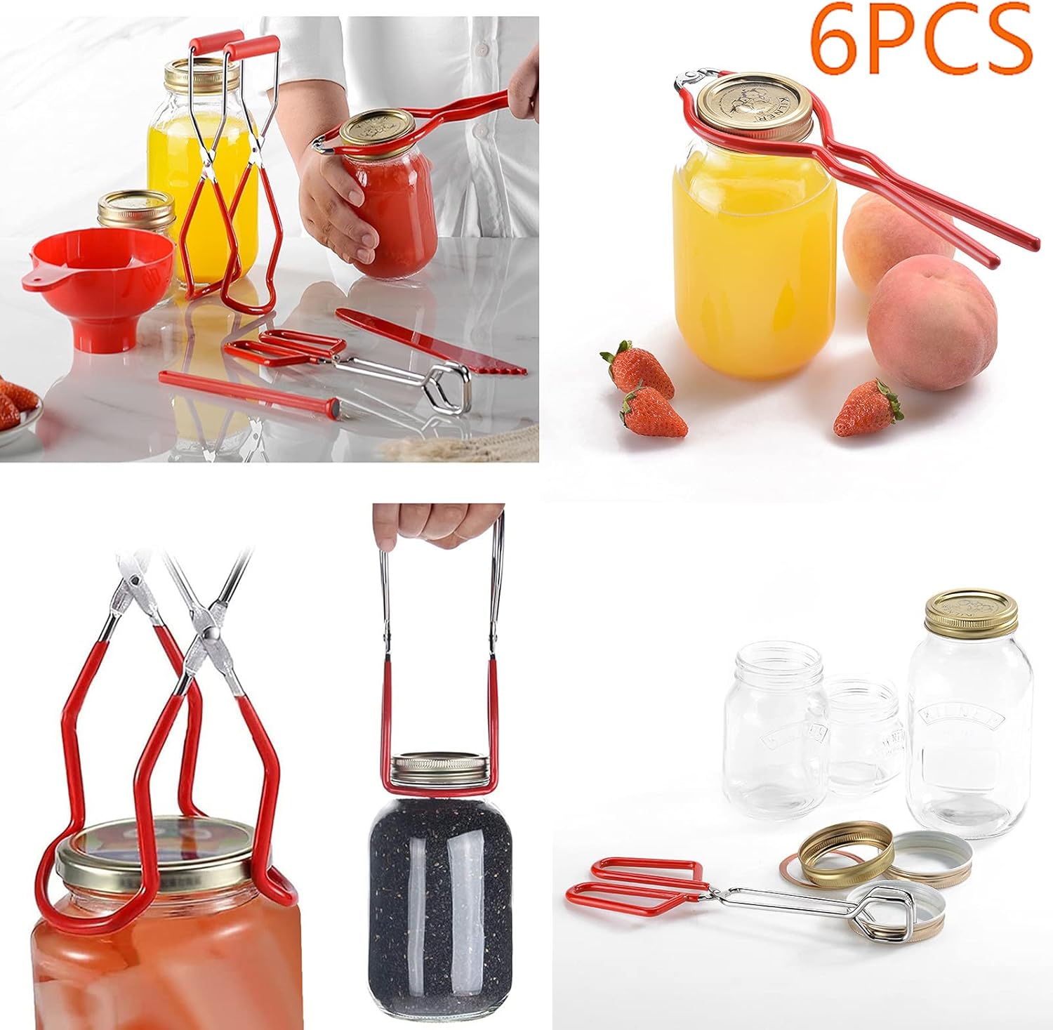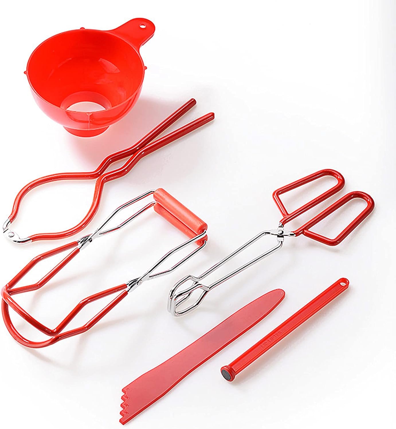 Product Description: Packing List: ——1 * Jar Lifter ——1 * Canning Tongs ——1 * Magnetic Lid Lifter ——1 * Graduated Splint ——1 * Wide Mouth Funnel ——1 * Jar Wrench Features: 1. This product brings more convenience to the family kitchen, so that you can avoid direct contact with food. 2. Can kit can lifter is suitable for cans of various sizes, which can meet all your needs for canned food. 3. A set of 6 tool kits are available to save your own fruits, jams, pickles and others. Specifications: Color: Red. Material: stainless steel + iron + plastic + rubber + magnetic material Size: Jar Lifter: 22.4 * 8 cm/8.8 * 3.1 inch Canning Tongs: 26 * 8.9cm / 10.2 * 3.5 inch Magnetic Lid Lifter: 17.5 * 1.7cm/6.9 *0.7 inch Graduated Splint: 22.6*3.1cm/8.9*1.2 inch Wide Mouth Funnel: 12.3*16.6*8cm/4.8*6.5*3.1 inch Jar Wrench: 27.6 * 8.3cm / 10.9 * 3.3 inch Detailed Explanation Of Functions: --Jar Lifter-- The pot of any size can be easily and safely taken out from boiling water to keep hands away from high temperature; --Canning Tongs-- The long pliers with red vinyl handle can easily clamp the substance in the can and the bottle cap; --Magnetic Lid Lifter-- The lid can be easily sucked up without direct contact with hands, which helps to keep the lid sterile. --Graduated Splint-- To make sure the bubbles don't get trapped in the jar, place a bubbler on the edge of the jar and gently move the food so that all trapped air is released. --Wide Mouth Funnel-- Large diameter, not easy to leak, can be divided into liquid, powder seasoning, etc; --Jar Wrench-- For sealing or opening the lid, it can be easily tightened to ensure that your preserves and canned food remain fresh. Matters Needing At