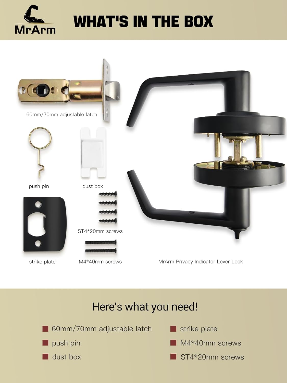 | Included Components | MrArm Privacy Indicator Lever Lock, 60/70mm adjustable latch, Strike plate, Push pin, M4*40mm screws, ST4*20mm screws, Dust box , Door Template, Instruction Manual |