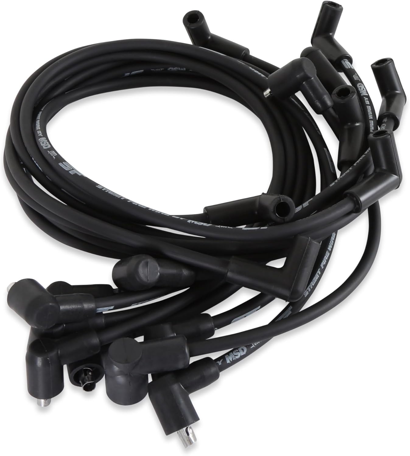 The street fire spark plug wires feature a low resistance conductor that's wrapped in a sleek and durable black sleeve. The terminals are covered in black boots that protect the conductor from engine heat to ensure spark delivery.