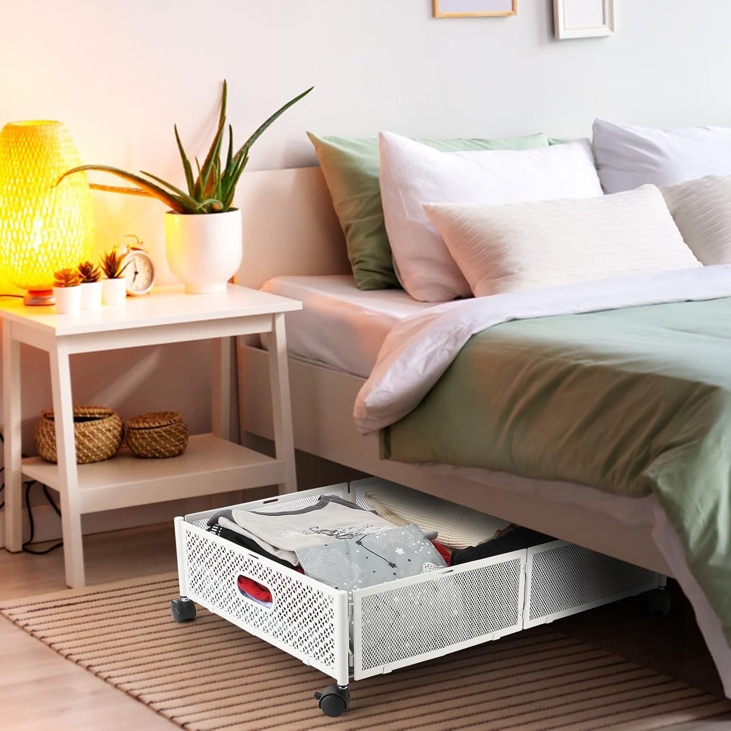 Features Durable and Spacious Metal Container: Our under the bed storage container is constructed entirely from high-quality metal, ensuring superior strength and durability. Convenient 360° Rotating Wheels: Experience effortless organization with the added feature of 360° rotating wheels. Easily pull out the storage container from under your bed for quick access to your belongings. Two of the four wheels can be locked in place by simply pushing the knob on it, ensuring the cart stays securely in position. Quick and Easy Assembly: We understand the frustration that can come with complex assembly processes. That's why we have simplified the installation of our under bed storage container into just two simple steps. Space-Saving Foldable Design: When not in use, our underbed storage container can be easily folded flat into an ultra-small size, making it convenient to store away. The unfolded size measures 23.6 x 15.7 x 6.1 inches, providing ample space for your belongings while still fitting snugly under your bed. Versatile and Multipurpose: It is perfect for storing seasonal clothing, shoes, bedding, and much more. The rolling design allows it to also function as under bed drawers on wheels, providing additional storage options and maximizing the use of your space. Specification Material: Carbon steel Color: Black Size: 60 x 40 x 15.5 cm Weight: 2000 g, 4000 g Package Include: 1x Under Bed Storage or 2x Under Bed Storage