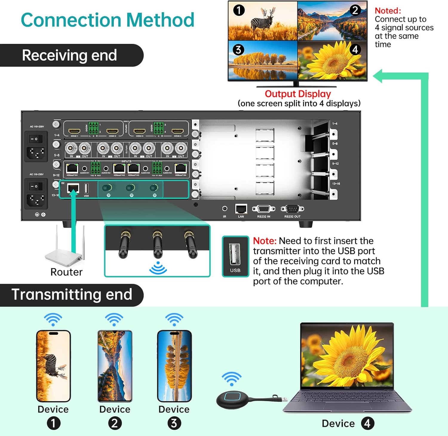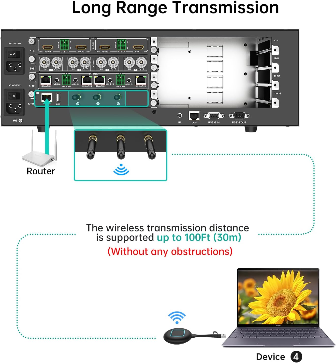 • Wireless Casting Card: A single receiving card supports simultaneous display of 4 images, enabling 4K@30Hz image transmission, with a transmission distance of up to 40 meters in an open environment