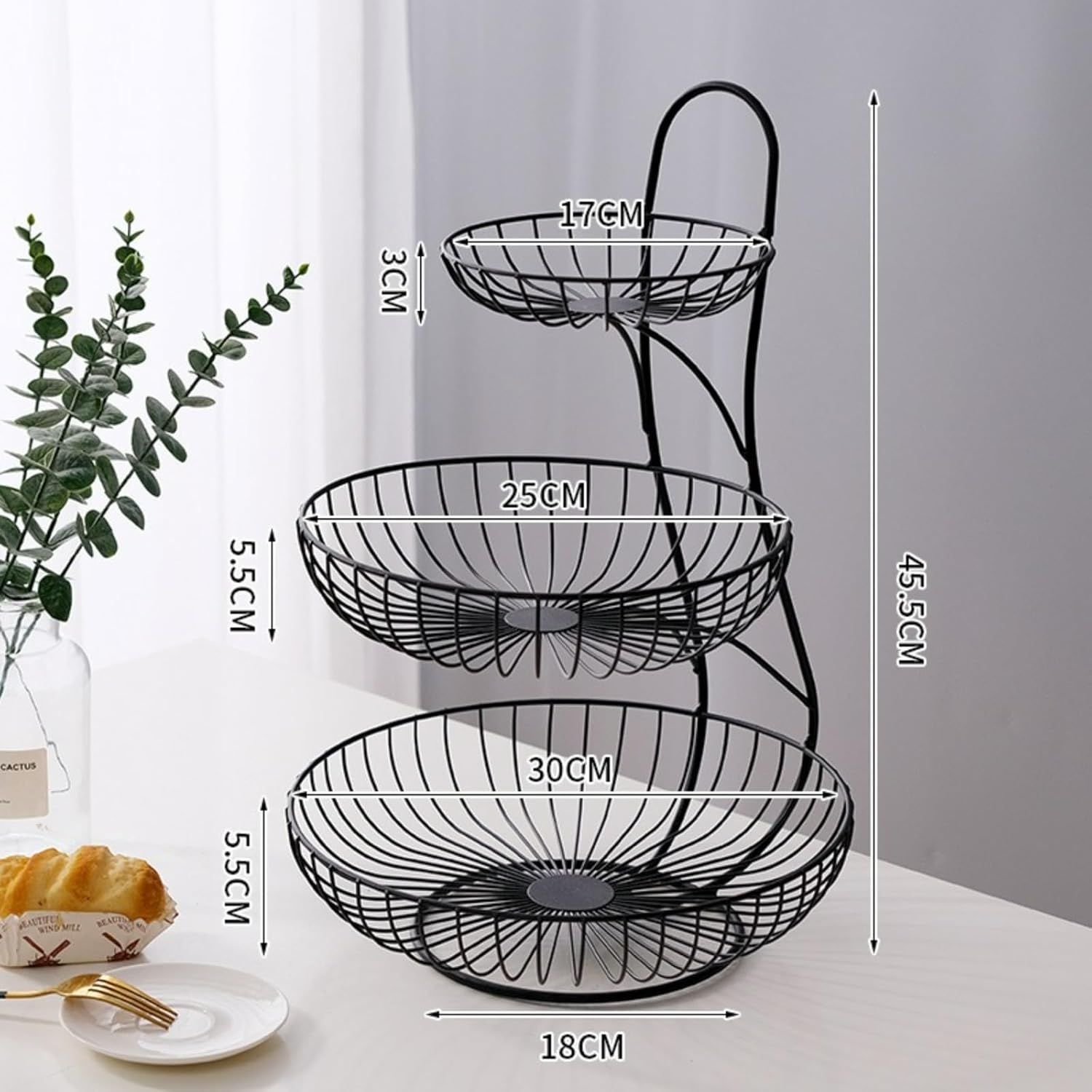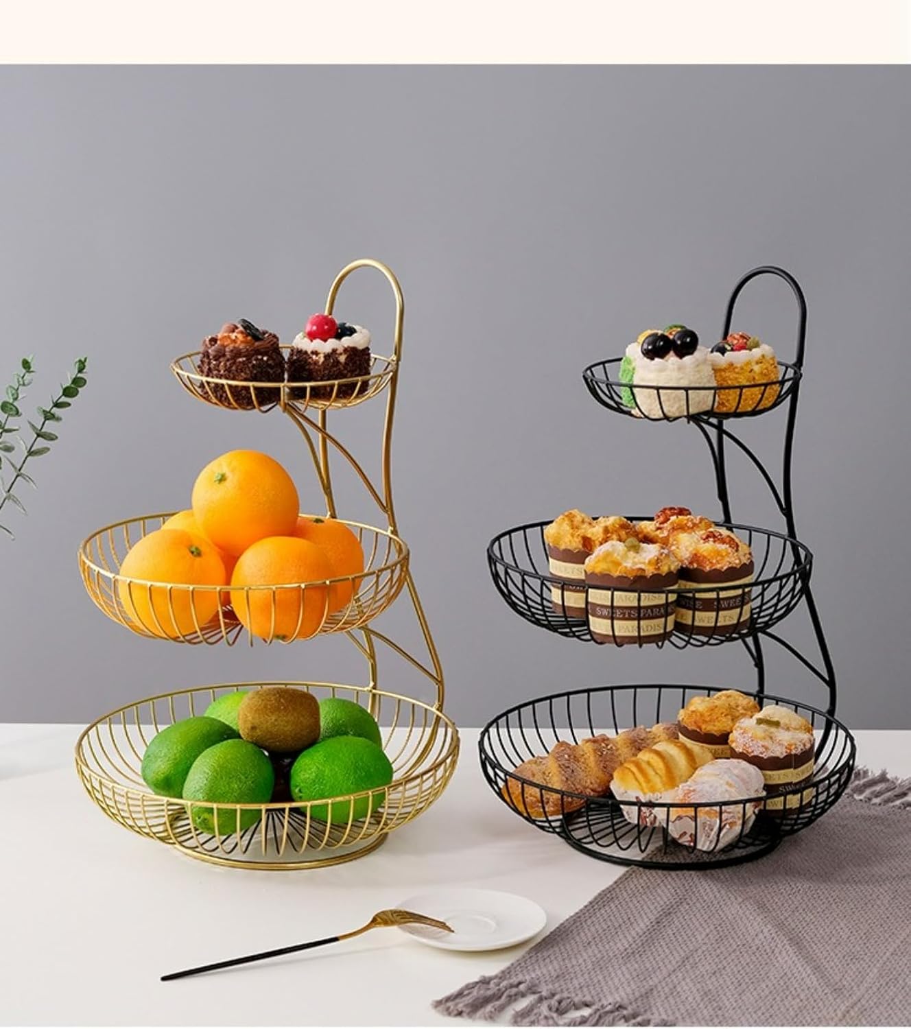 Name: Iron multi-layer fruit basketProcess: welding, baking paintMaterial: IronSpecifications: Gold three-layer fruit basket, black three-layer fruit basketStyle type: Light luxury retro