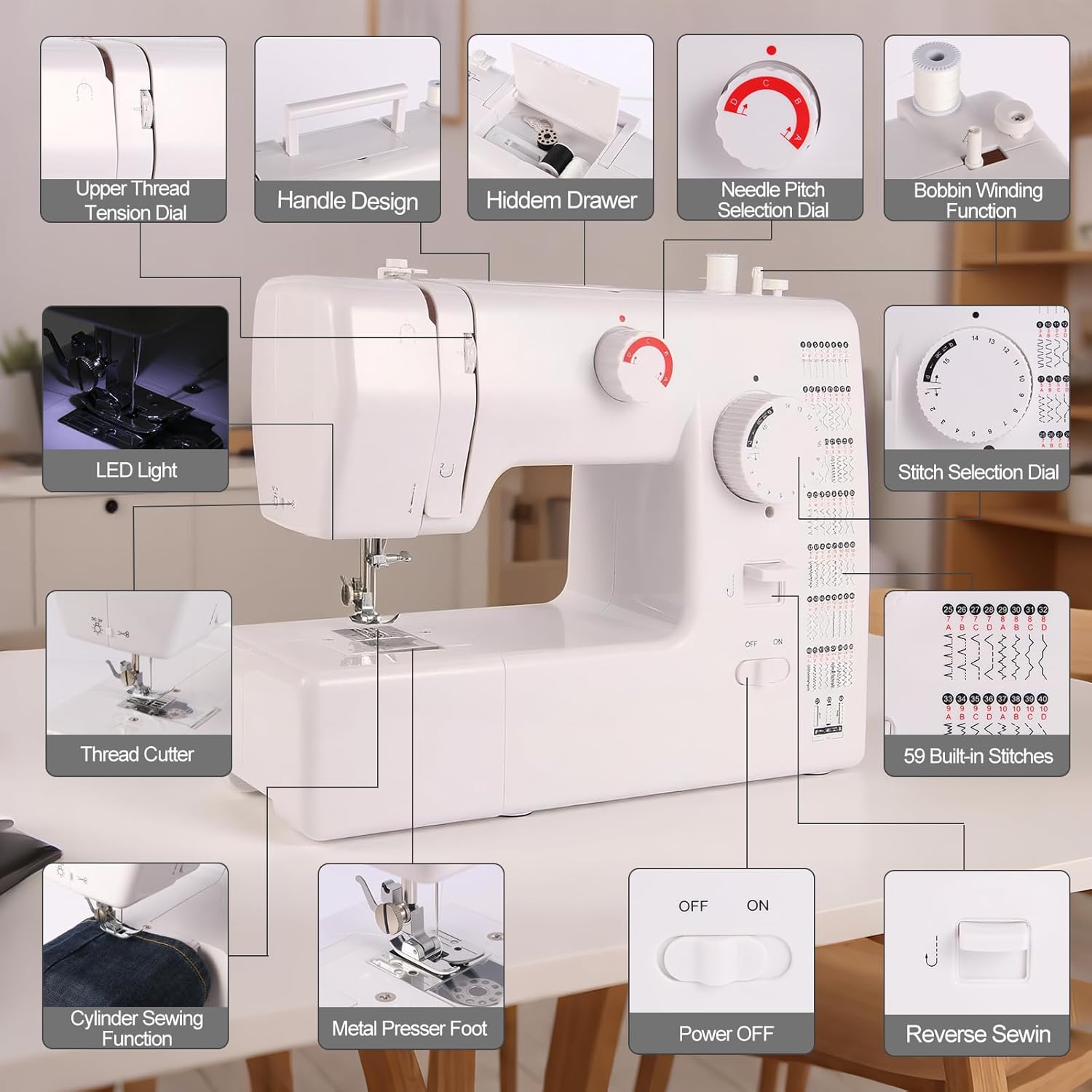 Our sewing machine is designed with asturdy full metal frame, designed for stability, and it is equipped with apowerful motor that delivers 50% more power than standard models, allowing youto easily sew multiple layers and thicker fabrics.Our sewing machine is expanded the spacefor arm manipulation, offering comfort and flexibility for medium to largefabric projects, and it has cylinder sewing function——perfect for tubular orhard-to-reach fabric areas.Our sewing machine offers 59 types ofstitches to choose from. Whether you need basic straight lines, exquisitedecorative stitches, or practical buttonholes, every stitch shows exquisite,satisfying your endless pursuit of perfection. Simply adjust the button to thecorresponding number to meet your needs.Our sewing machine has a built-in brightLED light, which can provides bright illumination of the sewing area whileeliminating shadows. And it has an automatic winding function, saving time andeffort! Get rid of the troubles caused by winding wires.Our sewing machine can adjust the tensionof your thread, turn the adjustable thread tension dial to avoid loose,puckered stitches.Our sewing machine is applicable for avariety of items and fabrics, such as clothing, silk, jeans, wool, hem pants,curtains, holes, toys, crafts, etc. which can penetrate 6 layers of denim. Youcan also complete handmade with your children, adding more fun!Product Specification:Material: Plastic & Metal materialSize: 16.73”x12.99”x6.57”Color: WhiteWeight: 11.07 lbsPackage Includes: 1. Sewing machine;2. AC/DC Adapter;3. Foot Pedal;4. Instruction Manual;5. Button hole foot;6. spool holder;7. Spare needles;8. Pre-filled Bobbins;9. Thread spool;10. Needle Threader;11. Thread Unpicker;12. Scissors;13. Tape Measure;14. Thimble.WARM TIPS: 1. The sewing machine has been threadedwhen it leaves the factory, and the fabric is used for testing, NOT a USEDproduct!2. We recommend that you read our manualcarefully and watch some videos before use.3.Please turn the hand-wheel manually to ensure that there is no thread jammingand other problems before turning on the power or change the types of stitches.