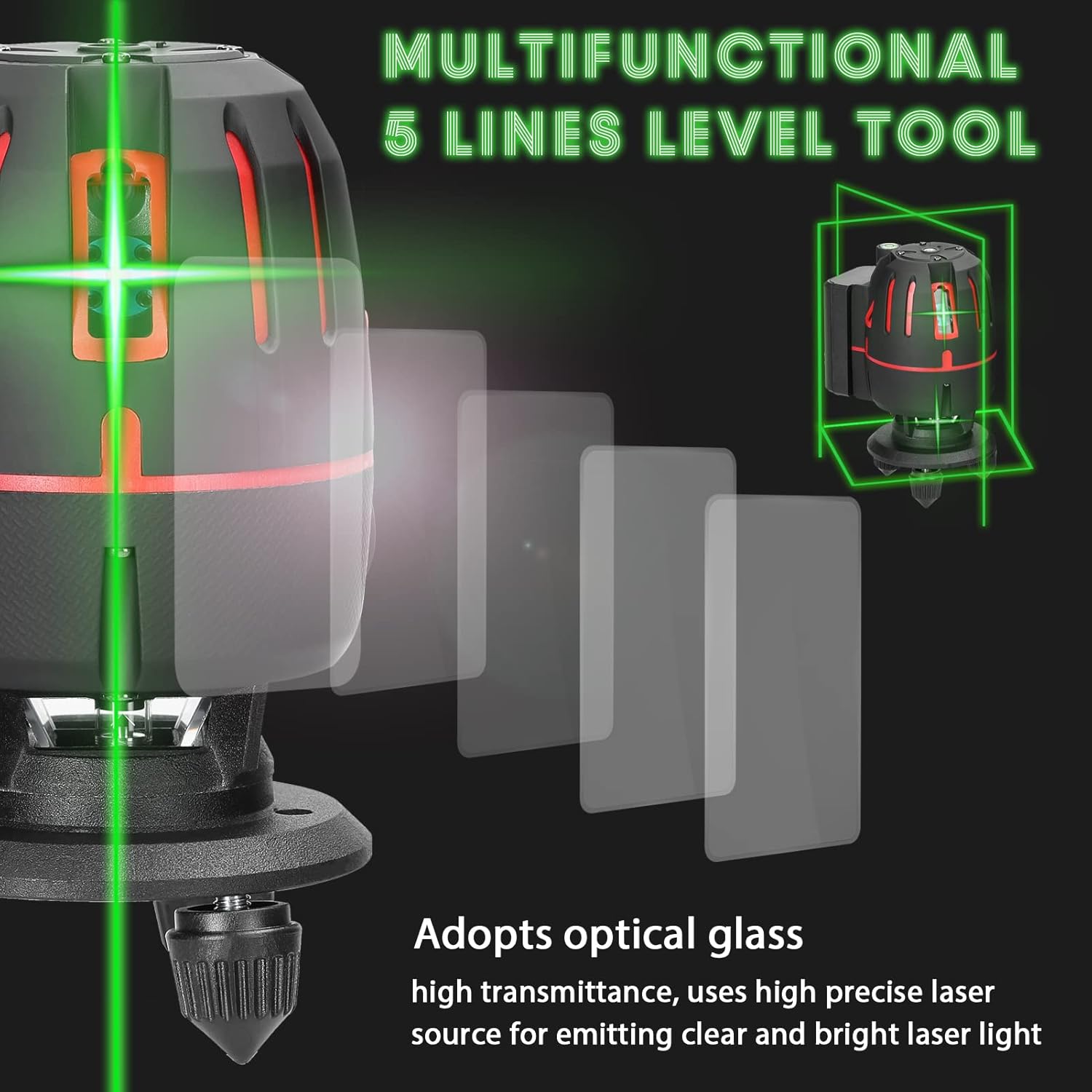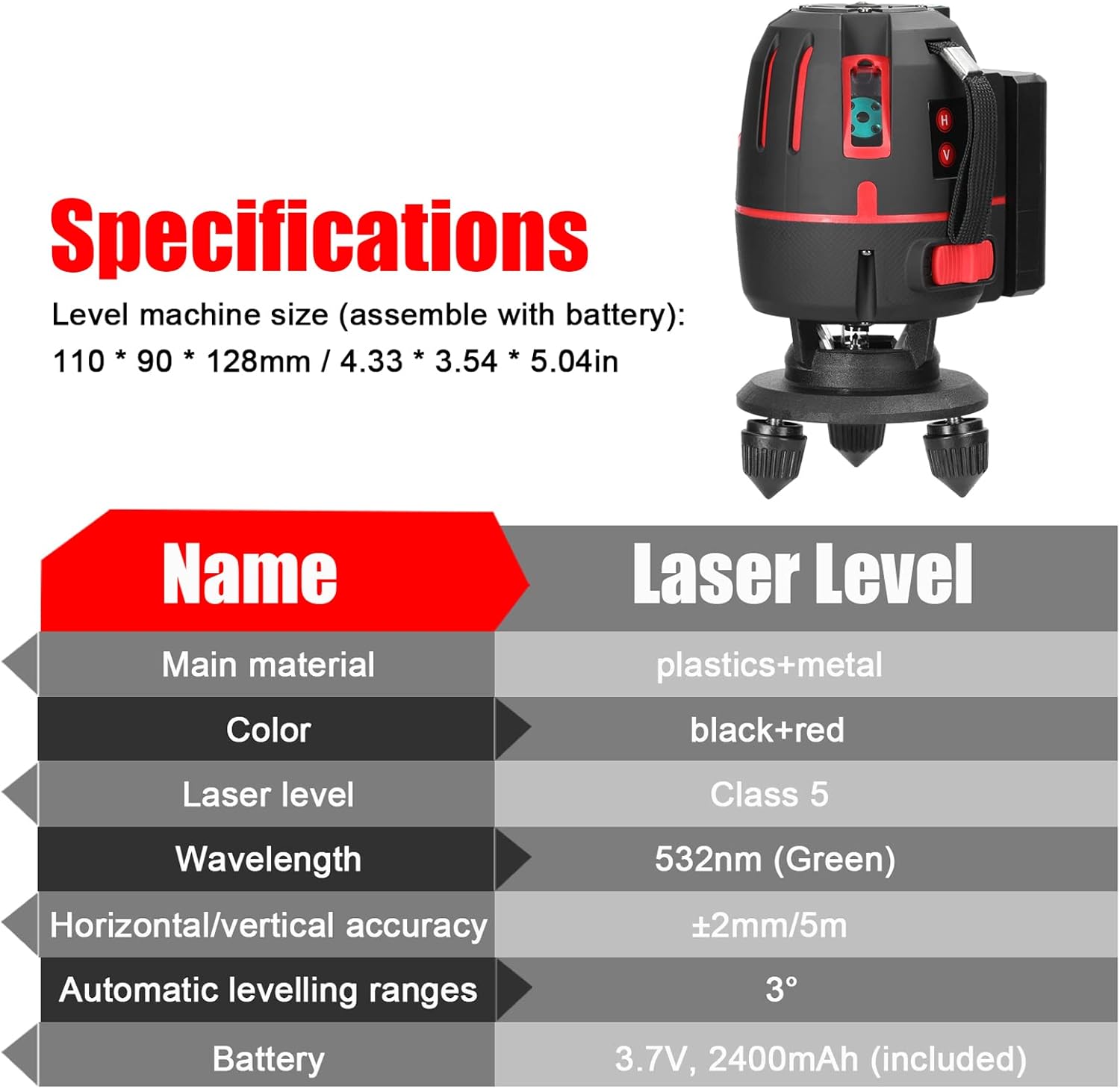 The level meter can emit 5 visible horizontal and vertical lines for the automatic leveling separately or simultaneously. It provides accurate horizontal and vertical data for indoor construction stakeout and calibration, easy to operate and versatile. Suitable for flooring tile layout, paneling, wallpapering, stenciling, wainscoting, finish carpentry, wall stud layout and partition installation. Notes: Please do not let the line shoot to your eyes directly. The output is located on the output hole. Do not stare directly at the . Do not disassemble the instrument and perform internal s by yourself. This instrument meets the radiation ty rating standard. Specifications: Name: Level Main material: plastics+metal Type: EU-Plug, USA-Plug (optional) Battery: 2 * reable lithium batteries, 3.7V, 2400mAh (included) length: 520/505nm (Green) Self-leveling angle: ±3° Level hine size (assemble with battery): 110 * 90 * 128mm / 4.33 * 3.54 * 5.04in Package size: 160 * 160 * 150mm / 6.30 * 6.30 * 5.91in Package weight: 864g / 1.90lb Note: Manual measurement, please allow the error of ±30mm. Packing List: 1 * Level hine with 360° Rotation Base 2 * Battery 1 * Battery Adapter 1 * Remote Controller 3 * porting Legs 1 * Carrying Bag
