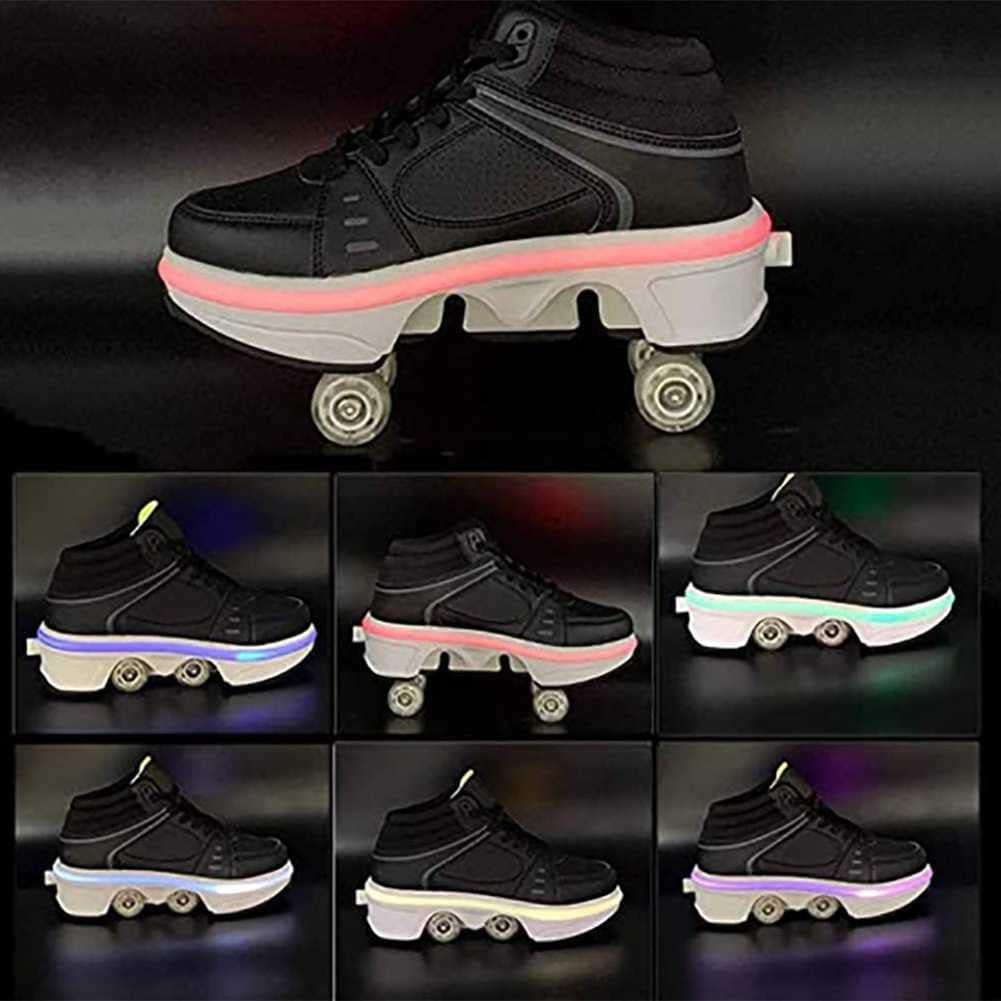 Product specifications:Sole Material: RubberCategory: RollerUpper material: super fiber leatherWheel type: double rowWheel material: PUCategory: skatesProduct size: 5,5.5,6.5,7,7.5,8.5,8.75,9,9.5,10.5Applicable crowd: adults, children, boys, girls, women, youthSize and foot length:No. 5: Internal length: 22.7 cm / 8.93 inchesNo. 5.5: Internal length: 23.3 cm / 9.17 inchesNo. 6.5: Internal length: 24 cm / 9.45 inchesNo. 7: Internal length: 24.7 cm / 9.72 inchesNo. 7.5: Internal length: 25.3 cm / 9.96 inchesNo. 8.5: Internal length: 26 cm / 10.24 inchesNo. 8.75: Internal length: 26.35 cm / 10.37 inchesNo. 9: Internal length: 26.7 cm / 10.51 inchesNo. 9.5: Internal length: 27.3 cm / 10.75 inchesNo. 10.5: Internal length: 28 cm / 11 inchesFeature:1. Adjustable wheel: retractable rear wheel for skates and classic sneakers.2. Type: Auto button. The security foundation of the invisible button.There is a button at the back of the shoe, hold it down, open the wheel, hold the button, then push the roller to the sole and release.For safety reasons, children must be accompanied by an adult when wearing these shoes.Suggestion: To ensure your feet are comfortable, please measure the length of your feet, and then use the size chart to select the correct size.