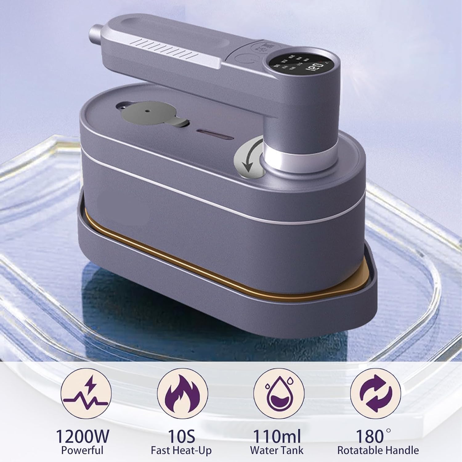 Product Features Professional Steamer Iron This small steam iron model is portable but powerful, with a high power of 1200W and a large capacity water tank of 110ml. It can quickly preheat and generate up to 25g/min of continuous steam within 10 seconds. After filling with water, you can continue steam ironing for 8-10 minutes. The packaging comes with a measuring cup, which is very convenient even if water needs to be added during use. This intelligent steam iron is also equipped with an LED display screen, which can clearly see the iron's 8 modes: dry ironing and 6-speed steam, as well as cleaning function. It is safe for all fabrics and can track the ironing status of the steam iron at any time, effectively removing wrinkles and not damaging clothes. The 180°rotating handle not only allows for comfortable horizontal or vertical ironing, but also makes it easy to store. It can be stored directly in drawers or other easily accessible places at home without taking up too much space. When traveling, it can be easily placed in a backpack or suitcase at any time, meeting your ironing needs for different occasions. This travel clothing steamer has rich functions and is easy to use. It is suitable for personal use and can also be used as a gift for family, friends, or colleagues during various holidays or commemorative occasions such as Thanksgiving, Halloween, Christmas, New Year, birthdays, housewarming, etc. Precautions for Use 1. Please replenish water promptly when lacking water to avoid dry burning and prolong the service life of the steam iron. 2.After use, please pour out the remaining unused water and wait for the panel to cool down for 30 minutes before storing it. Product Information Place of Origin: China Main Color:White&Purple Capacity: 110ml Rated power: 1200W Main Material: ABS+Aluminum Alloy Product Size:6.69*3.35*4.41 inches Package 1 X Portable Travel Steamer 1 X Measuring Cup 1 X Insulated Base 1 X Instructions 24-Hour Customer Service We provides excellent customer service. You can rest assured to buy our products, if you have any questions about the portable travel steamer, please contact us, we will reply you within 24 hours and solve your problem.