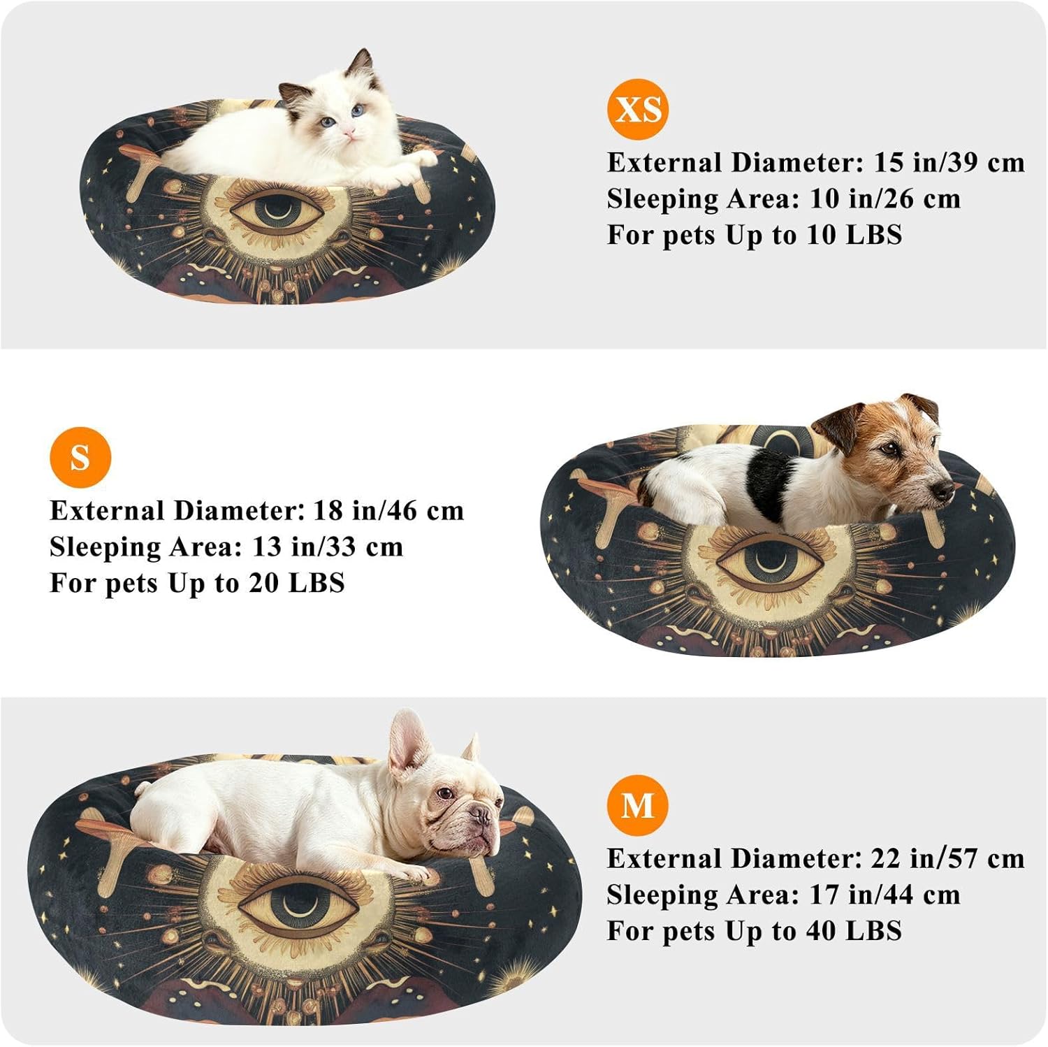 Size: XS: Diameter: 13 inches(sleeping area diameter: 10.2In); S: Diameter: 15.7 inches(sleeping area diameter: 13In); M: Diameter: 20 inches(sleeping area diameter: 17.3In). Small Dog Pillow Bed design, suitable for daily indoor use, allowing your beloved pet to take a comfortable nap. Material: Polyester + Filled + Drip Plastic. Our Dog Pillow Bed is designed in a donut style and made of soft plush fabric, which has a fine and smooth touch and can bring a warm and comfortable feeling to pets. Product Design: The overall shape is circular with raised edges, allowing your dog and cat to curl up for fun. Dog Pillow Bed provides support for the head and neck, promoting a sense of security without worry. Applicable Scenarios: This comfortable bed can be used by pets such as cats and dogs. Dog Pillow Bed can be used in scenarios such as living rooms, floors, sofas, cages, and cars. Washing Instructions: Hand wash or machine wash. Air dry in the shade. Please use a mild neutral detergent.