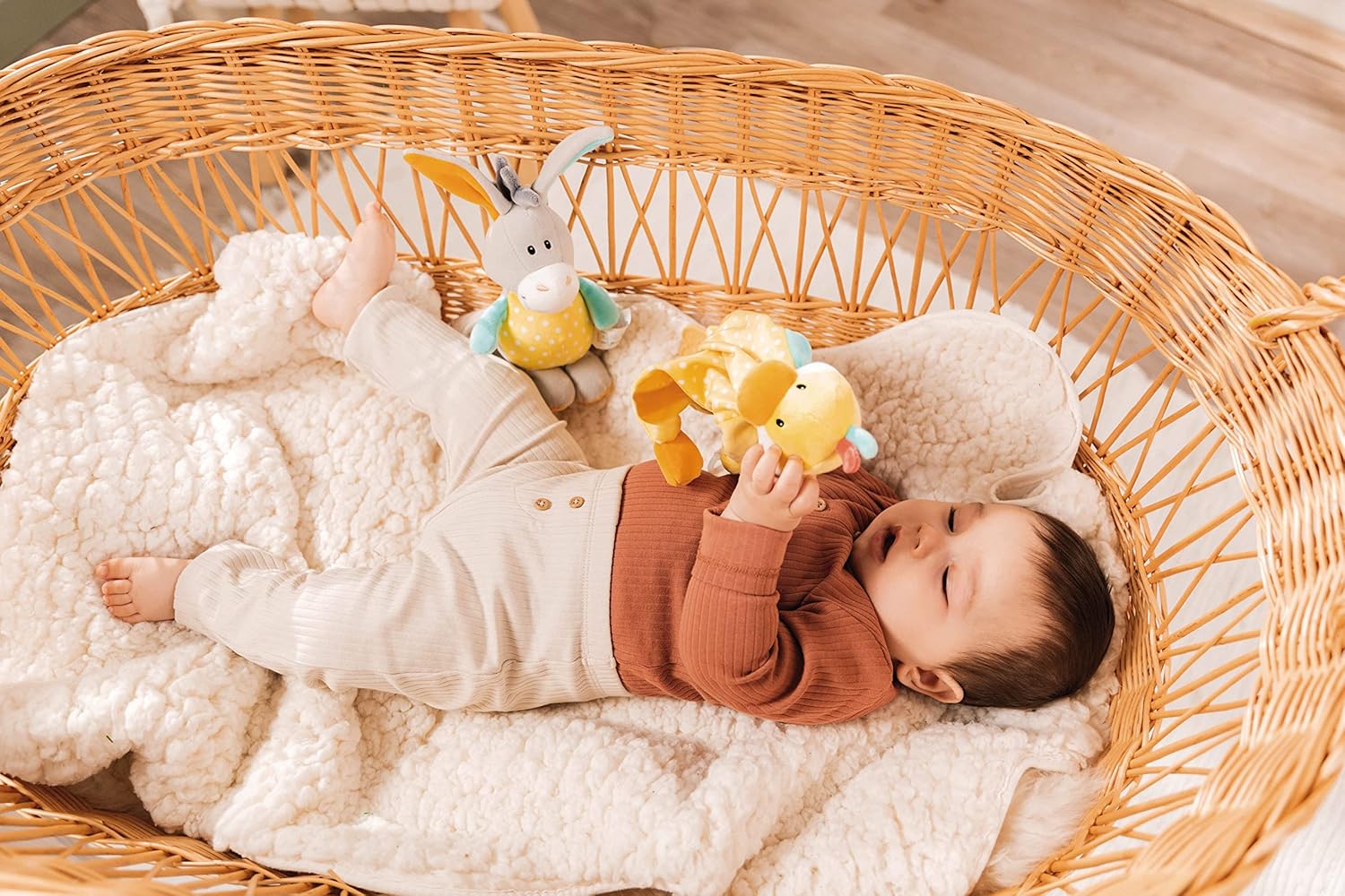 The 18cm wind-up music box made of plush in the shape of a cute donkey in a yellow and white dotted pyjama with different coloured ears and arms is a perfect gift for welcoming a new baby or a christening. The grey donkey impresses with his softly plush body and the simple wind-up mechanism. The integrated music box accompanies the baby into the land of dreams with Mozart's lullaby. Thanks to two ribbons, the cuddly toy & music box can be easily attached to the bed, stroller or infant car seat. The music box donkey of the My First NICI collection is a great bedtime assistant and at the same time even stimulates motor and sensory skills of babies.