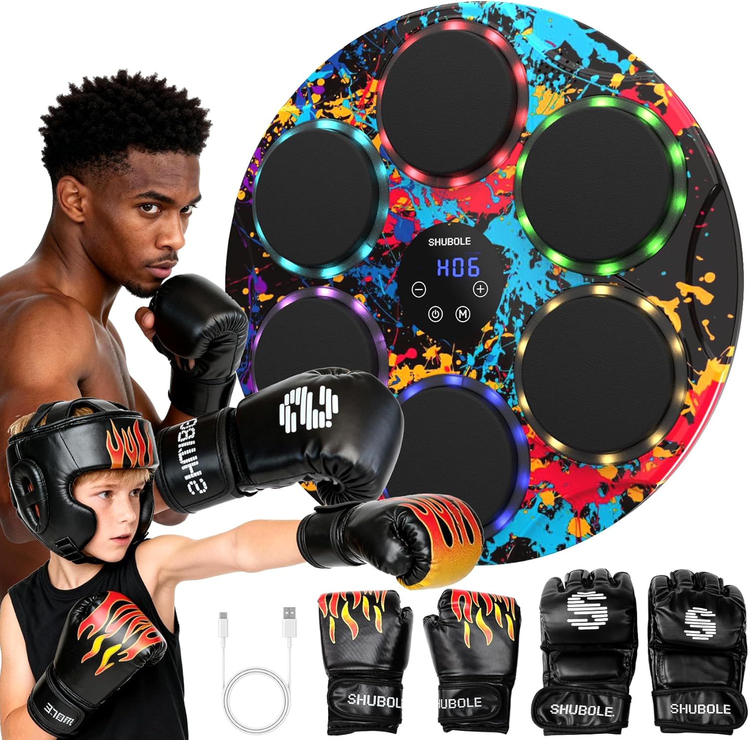 ●Smart bluetooth music boxing machine with 2025 upgraded, when hitting the target, the device will emit music and light effects, and enhance the visual experience through LED lighting effects. Support Bluetooth pairing, not only a music boxing machine can also be a stereo, you can exercise boxing at the same time switch to your favourite songs, it can bring you the best audio-visual effect of the best workout experience.Colorful LED lights lead triking targets,smart matching speed and lighting rhythm.If you striking faster,the lighting changed faster.●Smart Music Boxing Machine with LED flashing striking points is designed to enhance body flexibility and coordination and improve reflexes.Interact with the boxing machine through the screen touch control, it will emit rhythmic lights and music;can be connected to Bluetooth to play your favorite sports BGM. ●Musical boxing machine is very stylish and has a smooth, easy-to-clean surface.●Boxing machine wall mounted music help you complete daily training happily!●Product Information 1.Touch screen:1-30 volume level control;1-9 striking speed control;1-9 light display modes control;2 counting modes control; 2.Surround sound speakers:Comes with built-in surround sound music and percussion sound effects,and can also be connected to external mobile phone music via Bluetooth; 3.Colorful LED lights:Colorful LED lights lead triking targets,smart matching speed and lighting rhythm.If you striking faster,the lighting changed faster; 4.Chip automatic recording:automatically record the number of failed and successful punches 999 times; 5.Automatic power-off function:If there is no target striking within 5 minutes,it will automatically power off and shut down; 6.Rechargeable function:Equipped with a 2000mAH rechargeable lithium battery,it can be used continuously for 4H.