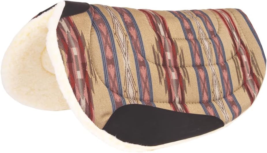 Mustang Herculon Top Western Barrel Saddle Pad This saddle pad is made from Herculon, one of the strongest, most stain-resistant fabrics available, insuring vibrant colors, resisting odor and saddle staining, and requiring minimal upkeep. A thick fleece lining molds perfectly to your horse's back and absorbs shock, creating a safer, smoother ride. Three southwestern patterns and wear leathers top it off to make this round, barrel cut saddle pad handsome as well as functional. Features: Round, barrel cut Shock absorbing Stain-resistant Durable Genuine suede wear leathers Item Specifications: Dimensions: 30"W x 30"L x 1" thick Materials: Herculon and fleece Colors: Apache Black, Cheyenne Hunter, Dodgeville Pottery