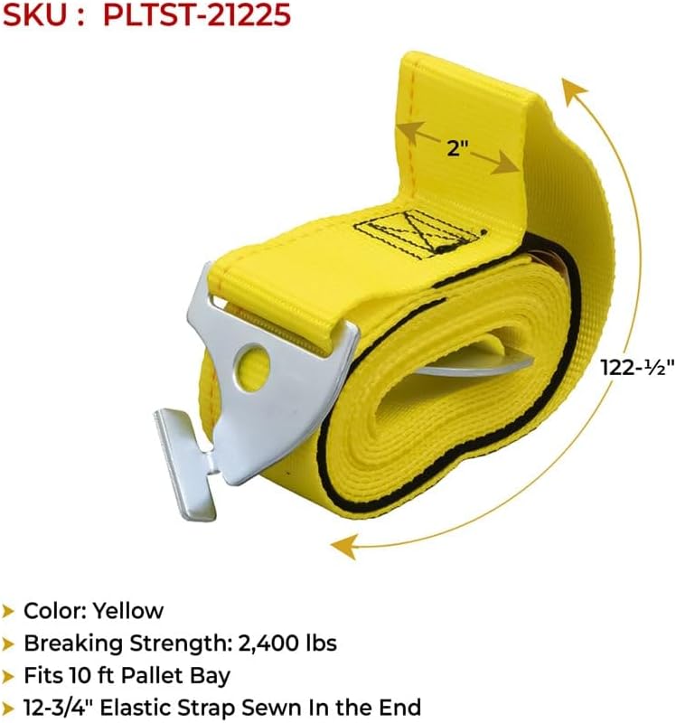 Pack Size: 8 PackPallet Rack Safety Straps are the best way to protect your large, palletized, and shrink-wrapped items from falling into the flue space or work areas. It will stabilize the pallet structure in different spaces, like warehouses, distribution centers, and industrial facilities. Safeguard your boxes by mounting these rack safety straps at the back of the rack as it’s necessary to fit-code standards required by insurance carriers. Protect your items on your pallet racks and learn more about our new addition.Sizing: The dimensions of our pallet safety straps are as follows:- length is 122-1/2" and width is 2", respectively. For wide flexibility and adjustability, we have added a 12-3/4" elastic strap on one end of the strap near the standard hook. Moreover, it will keep the tension maintained while ensuring to keep the pallets/shrunk boxes intact in place.High-Quality Webbing: The rack safety straps are engineered from high-quality polyester webbing. It’s durable and offers great strength against forces exerted by pallets. At the ends of the webbing, you’ll find a standard pallet rack hook of carbon structural coated with white-blue zinc for securely mounting to the rack and preventing rust. It will protect the boxes and goods on the rack while diminishing the risk of accidents, injuries, and damage to inventory.Yellow Strap for High Visibility: Our strap for the pallet safety rack is designed in yellow color to ensure high visibility. The color will attract the eyes in the warehouse thus, making it noticeable to the personnel working. People will walk cautiously near the rack, alerting them to avert potential hazards. Easy Installation: You will find a standard metal rack connector on each end of the strap, which makes the snug fit easy, secure, and simple. You don’t need additional tools and hardware to install the straps. Simply, cover it around the 10 ft pallet and hook it in the metal rack. In the same way, you can remove the hook whenever you need.Note:Regularly inspect any sign of wear and tear, damage, or loosening.Replace any damaged strap for optimal safety and efficiency.
