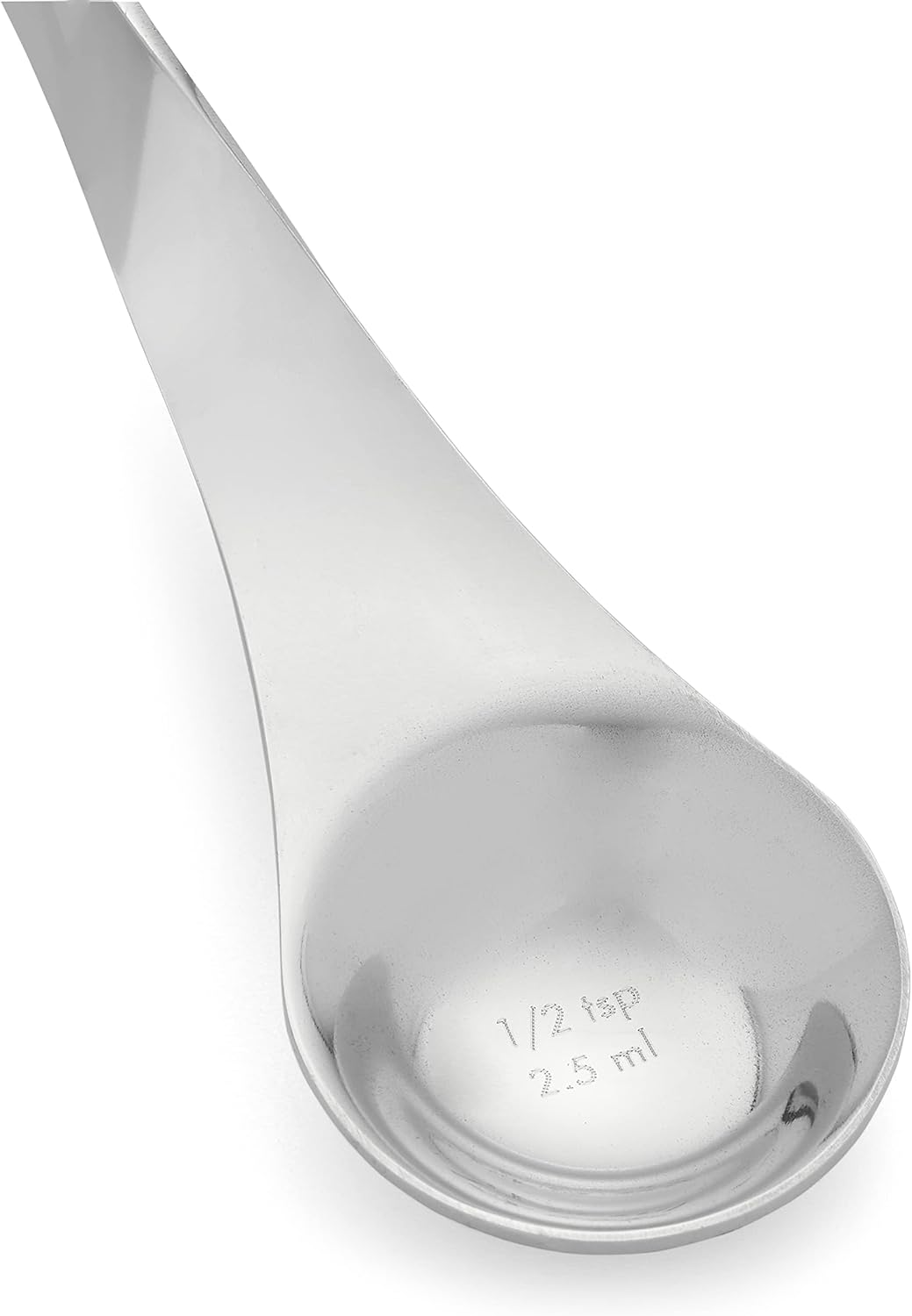With their artful twist shape, this set of four measuring spoons provides a modern update to a kitchen staple. Each spoon is conveniently labeled with both the standard and metric measurement; spoon measurements include 1 tablespoon, 1 teaspoon, 1/2 teaspoon, 1/4 teaspoon.