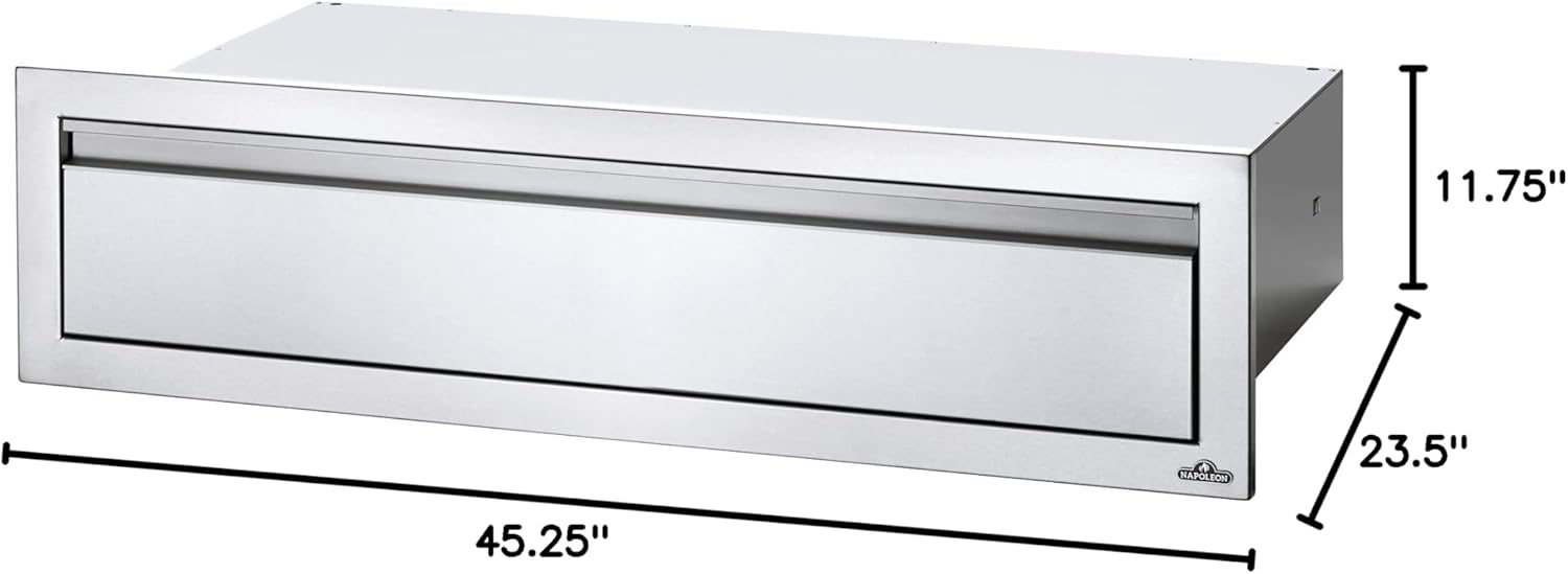 Creating your own custom grill island has never been easier with Napoleon's Built-In Components. Every great outdoor kitchen needs storage; this stylish single drawer is extra wide at 42" x 8" and features stainless steel construction, soft closing hardware, seamless trim, and anodized aluminum handles. Perfect for storing your favorite Napoleon Accessories, spices, and anything else you need for outdoor cooking.