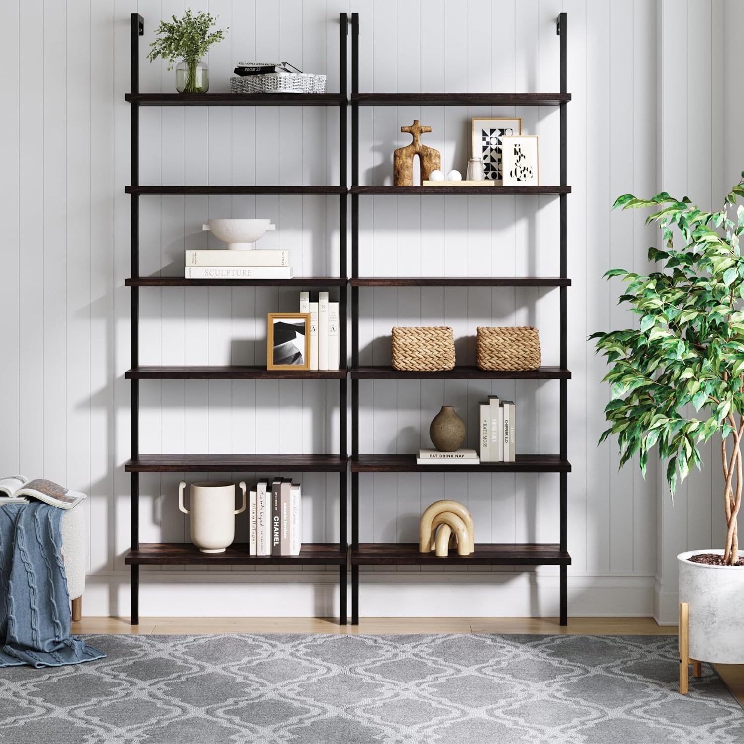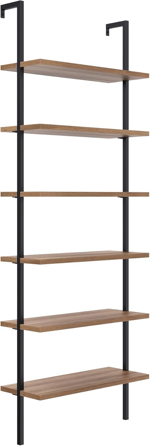 Our elegant Theo 6-shelf industrial bookcase has a sleek style that will complement your home office or living room. The tall, open-shelving structure will add visual space for your home to glam up any room with its sleek wood shelves and matte metal frame. This easy-to-assemble wall mount bookshelf provides ample storage and display space. Nathan James is the furniture company built for this generation. You don't need to spend a fortune to get quality design-first furniture and when we say easy assembly, we mean it. Our guarantee is our word. Your purchase is backed by a 100% money-back guarantee. If you have any quality issues just contact us and we will send you a replacement immediately—no questions asked.Materials:-Matte Black metal frame -Laminate oak shelves Assembly Must-Haves:-Scissors-Phillips-head screwdriver Weight Limit:-55 lbs. per shelf