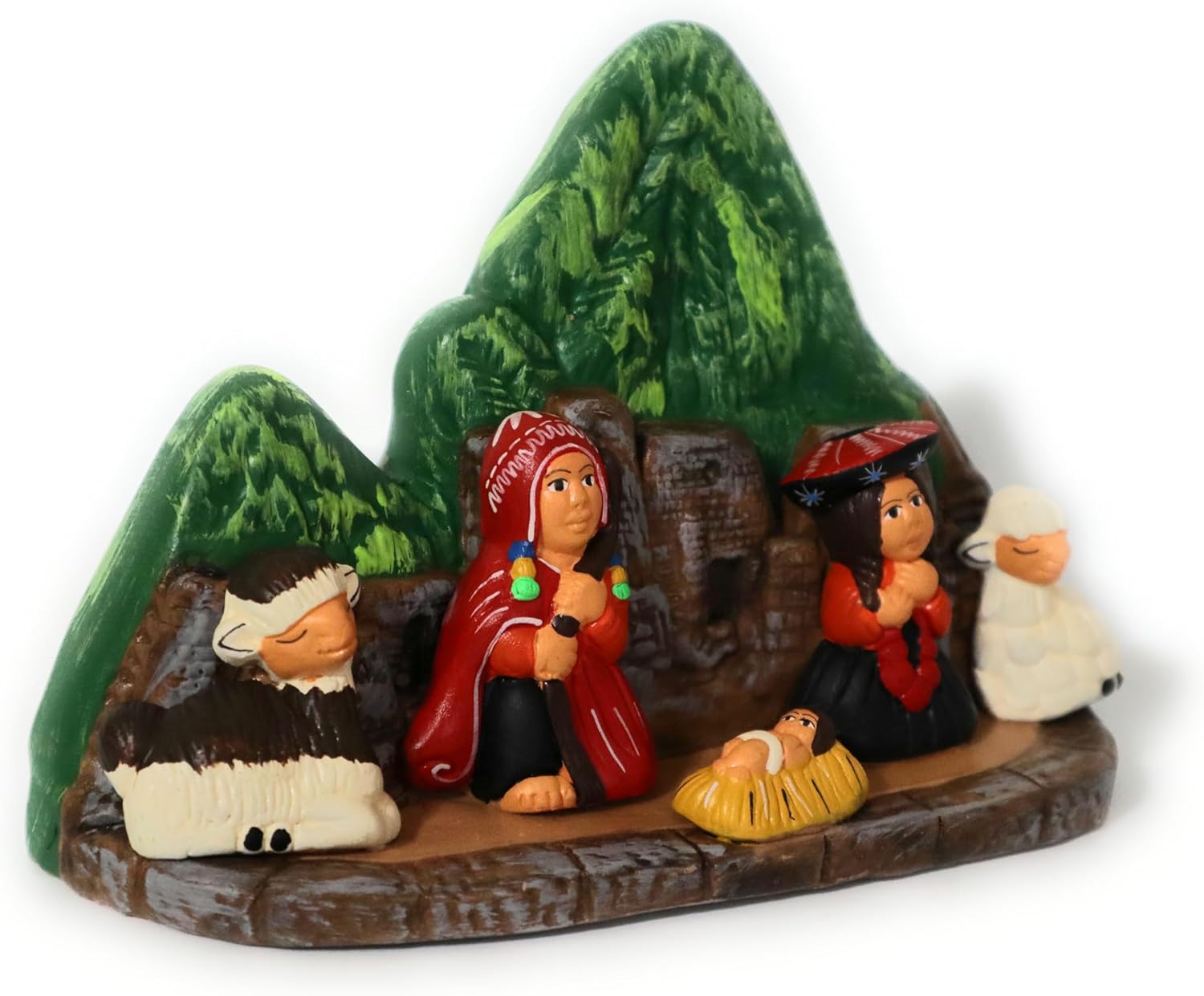 Immerse yourself in the rich cultural heritage of a region with this exquisitely crafted figurine. Handmade with intricate attention to detail, it depicts a vibrant Christmas scene with four figures nestled amidst towering green mountains that replicates the Archeological and famous citadel of Machu Picchu. The characters includes Joseph, Mary, Baby Jesus are adorned in traditional Andean attire accompanied by two sheep. This ornament offers a glimpse into the customs and traditions of the local people of Peru.