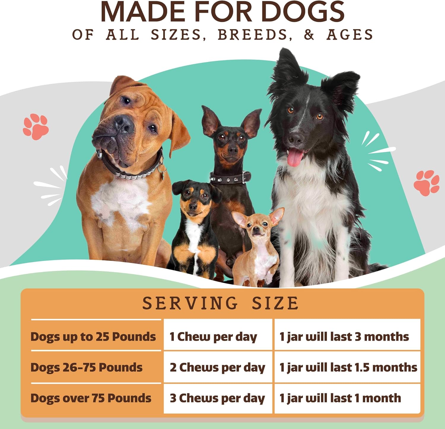 "Multivitamin and Calming Chews for Dogs - Comprehensive Health and Anxiety Relief Bundle Give your furry friend the ultimate in health and wellness with our Multivitamin and Calming Chews Bundle. This unique combination addresses your dog’s nutritional needs and helps reduce anxiety, ensuring they lead a happy and healthy life. Complete Nutritional Support: Our multivitamin chews are packed with 25 essential vitamins and minerals, including Vitamin A, Vitamin D, and Calcium, promoting overall health. These chews boost energy levels, support joint health, and maintain a shiny coat. Perfect for dogs of all ages and sizes, our multivitamin chews provide the daily nutrition your dog needs in a delicious Peanut Butter and Bacon flavor they’ll love. Stress and Anxiety Relief: Our calming chews are formulated with natural ingredients like Chamomile, L-Theanine, and Thiamine to help reduce anxiety and stress in dogs. These chews are ideal for situations that typically cause anxiety, such as loud noises, travel, or being home alone. They promote a sense of calm and relaxation, ensuring your pet remains stress-free and comfortable. Key Benefits: Joint Health and Mobility: The multivitamin chews support healthy joints, helping to maintain mobility and activity levels. Skin and Coat Vitality: Nutrients in the multivitamin chews promote a healthy, shiny coat and vibrant skin. Anxiety Reduction: The calming chews help soothe anxiety and stress, making them perfect for stressful situations like vet visits, fireworks, or long car rides. Daily Nutritional Support: Ensure your dog gets the essential vitamins and minerals needed for overall well-being. Delicious Flavor: Both chews come in a tasty Peanut Butter and Bacon flavor that dogs can’t resist. Usage Instructions: Multivitamin Chews: Give 1 chew per day for dogs under 25 lbs, 2 chews per day for dogs 26-75 lbs, and 3 chews per day for dogs over 75 lbs. Calming Chews: Administer as needed based on your dog’s weight and an