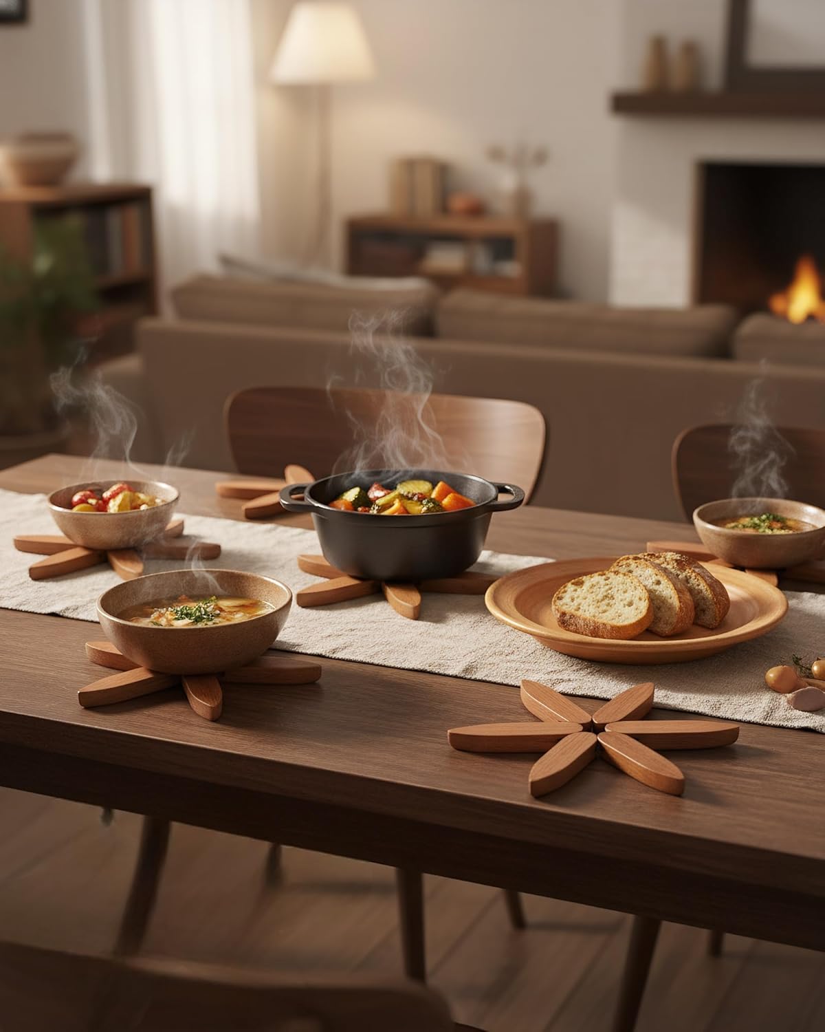 Artisan Craftsmanship Meets Functional Design: Natural Wood Trivet SetDiscover the perfect balance of natural beauty and practical protection with our handcrafted Black Walnut Wooden Trivet Set. Meticulously crafted from premium solid wood, each piece combines artisanal attention to detail with intelligent functional design, offering reliable heat protection while enhancing your home's aesthetic appeal.Intelligent Heat Protection SystemOur wooden trivets provide essential protection for your valuable surfaces against heat damage from cookware, serving dishes, and kitchen appliances. The innovative foldable trivet design utilizes natural physics - simply place the compact tree-shaped form on your surface, then set down your hot item. The weight automatically causes the expandable trivet to unfold, creating a stable protective barrier between your hot cookware and delicate surfaces. This intuitive functionality makes these wooden pot holders both convenient and effective for daily kitchen use.Natural Wood CraftsmanshipSelected for its durability and distinctive grain patterns, solid black walnut wood forms the foundation of each natural tree trivet. Our artisans employ traditional woodworking techniques combined with careful multi-step finishing processes that enhance the wood's natural beauty while creating a smooth, splinter-free surface. Each wooden tree hot pad showcases the unique character of its source material, with variations in grain pattern and color that ensure no two pieces are exactly identical - a testament to genuine handcrafted quality.Complete Set IncludesFour (4) handcrafted black walnut wooden trivetsOne (1) matching wooden display standCare and use instructionsSimple Care Instructions:Wipe clean with a damp cloth as neededAvoid prolonged soaking or dishwasher use