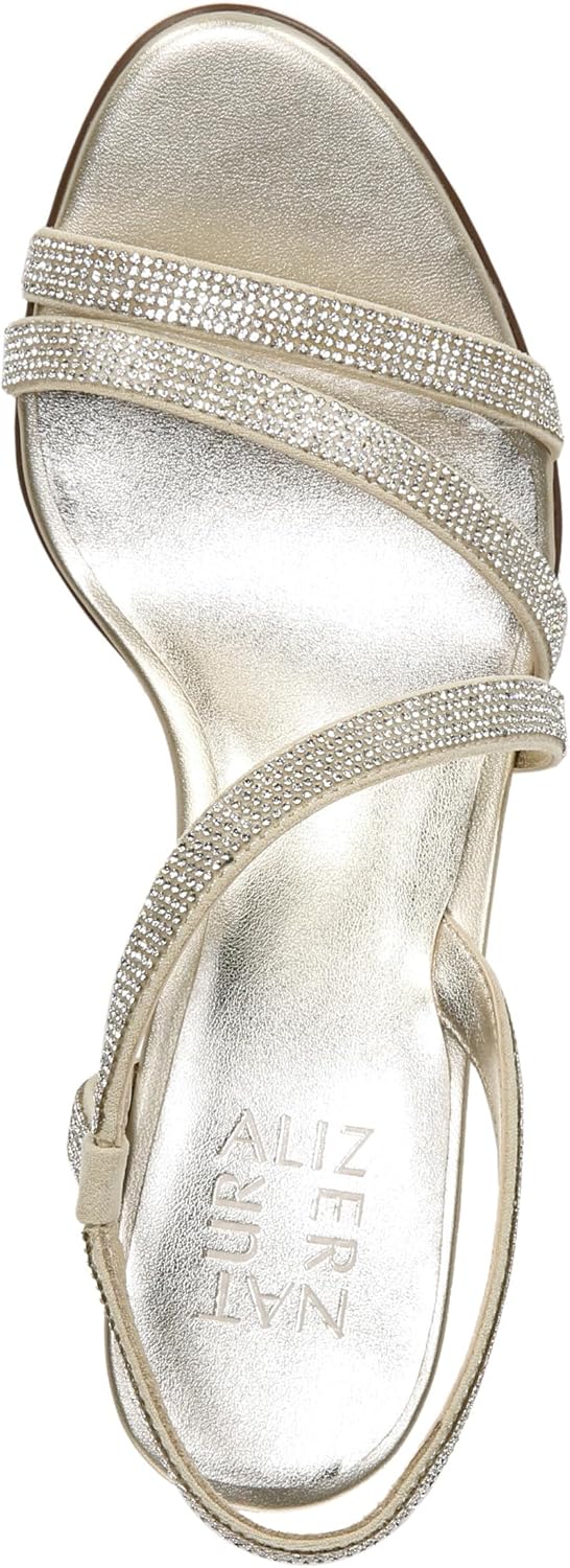 From our Party Ready and Wedding Shop collections // Long-lasting comfort. From day to night, these strappy sandals for women let you get into party mode. Available in narrow, medium and wide width heels for women, you have options. All-day womens sandals with slingback strap for easy on/off. Leather or fabric upper with an open toe and sparkly rhinestone crystals on these fashionable women's shoes. Adjustable buckle closure (on leather styles only). Contour+ technology: an innovative cushioning system anatomically sculpted to meet every contour of your foot for a premium fit and all-day comfort experience. Non-slip outsole. 2 1/2 inch block heel. Consciously packaged: 100% of our shoe boxes are made of 80% recycled paper + soy-based ink. Designed using sustainable materials. WHY YOU'LL LOVE IT: Designed to the contours of a woman's foot. Available in an inclusive range of sizes and widths for a custom-designed fit and all-day wear, with a promise of both elegance and utility. The Beautiful Fit. Since 1927. Naturalizer was one of the first shoe brands that women could turn to for the feminine style they coveted and the comfort they thought was impossible to attain. Naturalizer's fresh, unpretentious designs are a smooth fit with your wardrobe, your life and your own unique style. Naturalizer promises style that makes you look good and feel good - always.